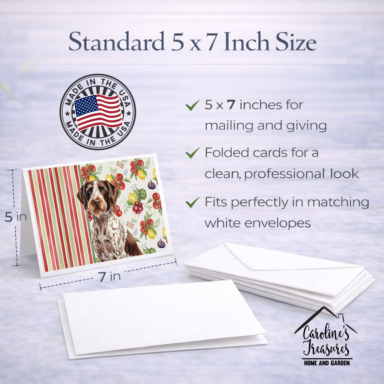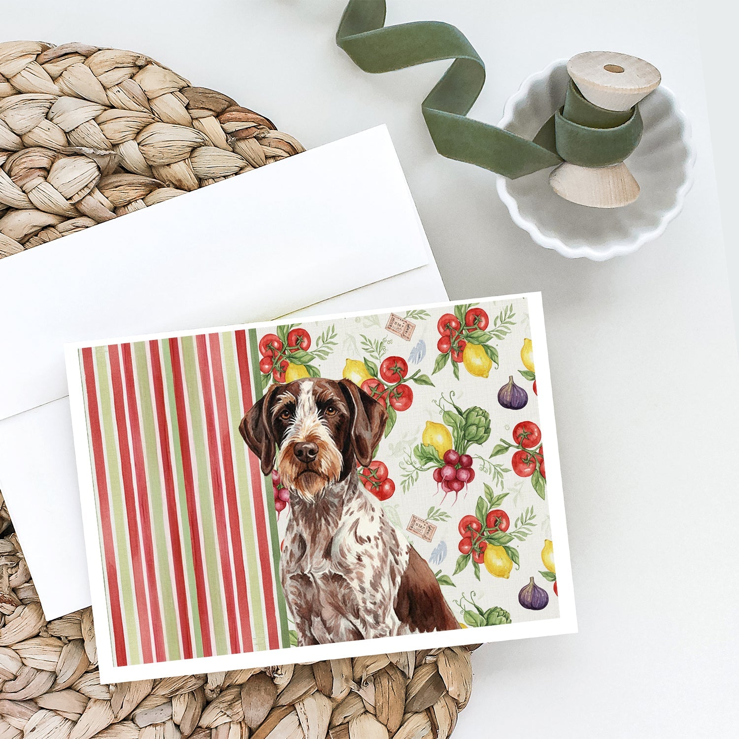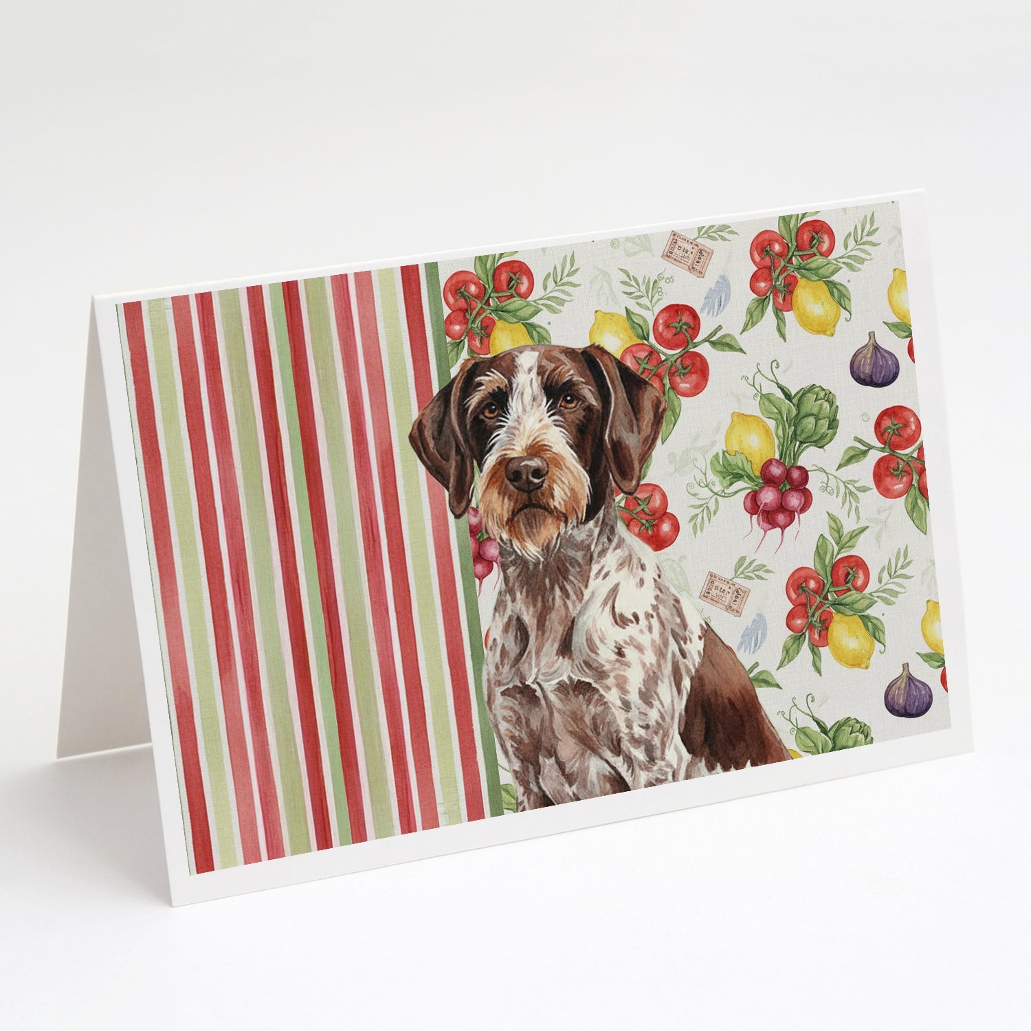 Shown here is the Roan German Wirehaired Pointer Vegetables Greeting Cards Pack of 8 from Caroline's Treasures featuring artwork of a German Wirehaired Pointer in a Everyday design. The detailed illustration and vibrant colors make it a standout accent that celebrates both seasonal style and love for the subject. This image features a vibrant watercolor vegetable pattern with tomatoes, lemons, artichokes, figs, radishes, and leafy greens arranged in a repeating design, paired with classic red and green stripes. The bright, garden-fresh palette creates a cheerful, farmhouse-inspired look that feels lively, welcoming, and perfect for kitchen décor. Everyday décor celebrates personal style and the small moments that make a house feel like home. Thoughtful designs add warmth and personality that can be enjoyed year-round. Celebrate special moments with Caroline's Treasures Printed Greeting Card Pack. This pack includes eight beautifully folded 5x7 cards, accompanied by eight matching white envelopes. With blank interiors, these cards provide ample space for your personalized messages and heartfelt holiday greetings. Each card features captivating full-color artwork, meticulously printed in our facility on high-quality 80 lb cover stock or 216 GSM. The super smooth finish of the white cards enhances the visual impact of the artwork, creating a truly stunning presentation. Designed by our talented in-house artists or licensed artists, the artwork on these cards showcases their creativity and attention to detail. From vibrant illustrations to captivating designs, each card tells its own unique story. Whether it's for birthdays, anniversaries, holidays, or any special occasion, Caroline's Treasures Greeting Card Pack is the perfect way to convey your heartfelt sentiments. Share joy, love, and warm wishes with these exquisite cards and make every moment unforgettable. Perfect for: Writing personal messages, everyday correspondence, and thoughtful notes, Dogs-themed stationery collections, or year-round use for German Wirehaired Pointer lovers. German Wirehaired Pointers are rugged sporting dogs known for their intelligence and determination. This breed is admired for its versatility, endurance, and strong work drive. Makes a heartfelt gift for: German Wirehaired Pointer owners, Dogs lovers, Everyday gifts, pet parents, friends who adore their German Wirehaired Pointer, or anyone celebrating Dogs.
