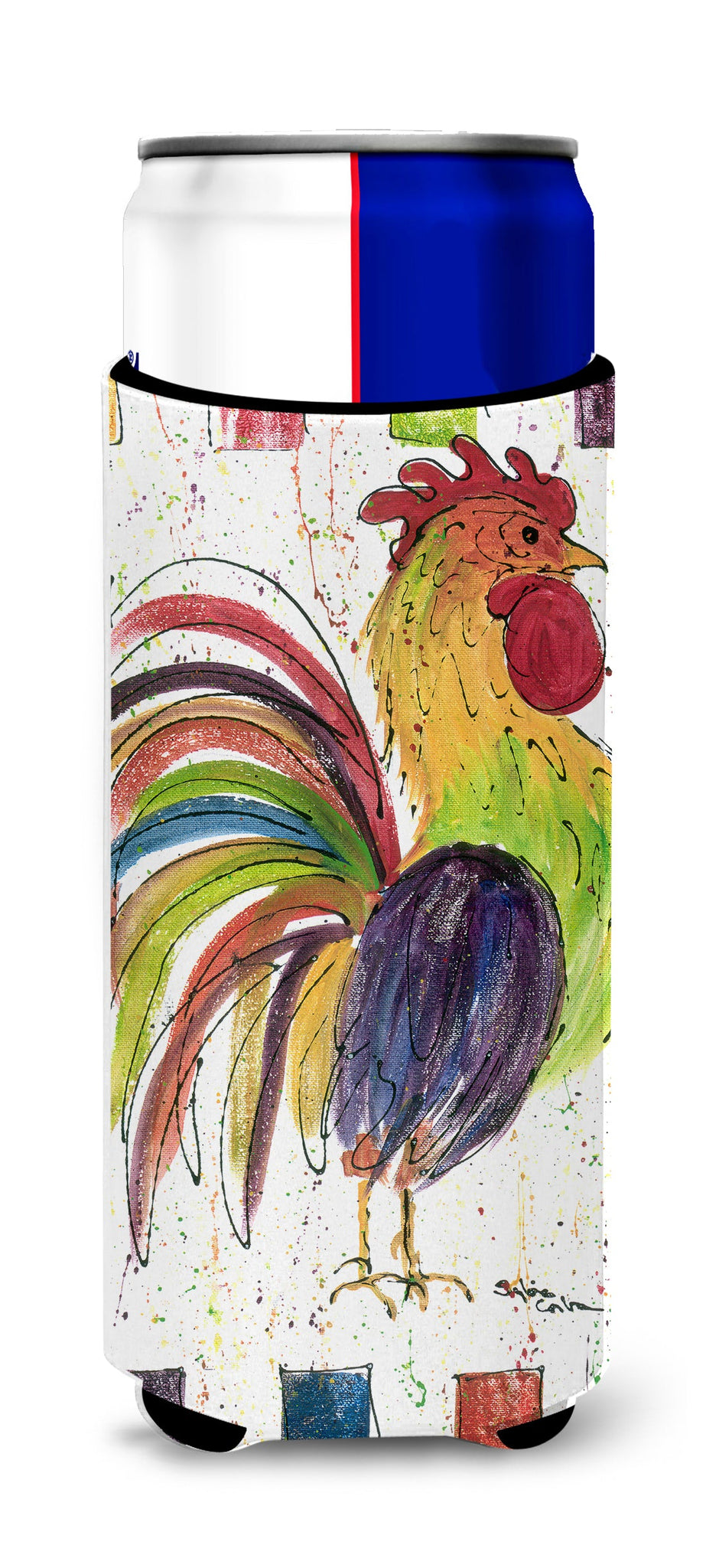 Decorate your space with our Rooster artwork on a Slim Can Hugger. Elevate your beverage experience with our Slim Can Huggers, uniquely designed to fit a variety of your favorite 12 oz slim cans. Perfectly suited for Michelob Ultra, Starbucks Refreshers, Heineken Light, Bud Lite Lime, Dry Soda, Coors, Resin, Vitaminwater Energy, and Perrier Cans, our huggers ensure your drink stays refreshingly cool. The feature that sets our can huggers apart is the striking full-color artwork, exclusively created by one of our talented artists. It adds a touch of individuality and style to your drink, making it easier to identify in a crowd. A unique blend of practicality and flair, these huggers are an absolute must-have at any gathering. Our can huggers are not just beautiful but also incredibly durable. The design won't fade or peel off, and they can be safely cleaned in a washing machine. These collapsible beverage insulators are easy to store and transport, making them perfect for all occasions. Enjoy your drinks in style and comfort with our exceptional Slim Can Huggers.