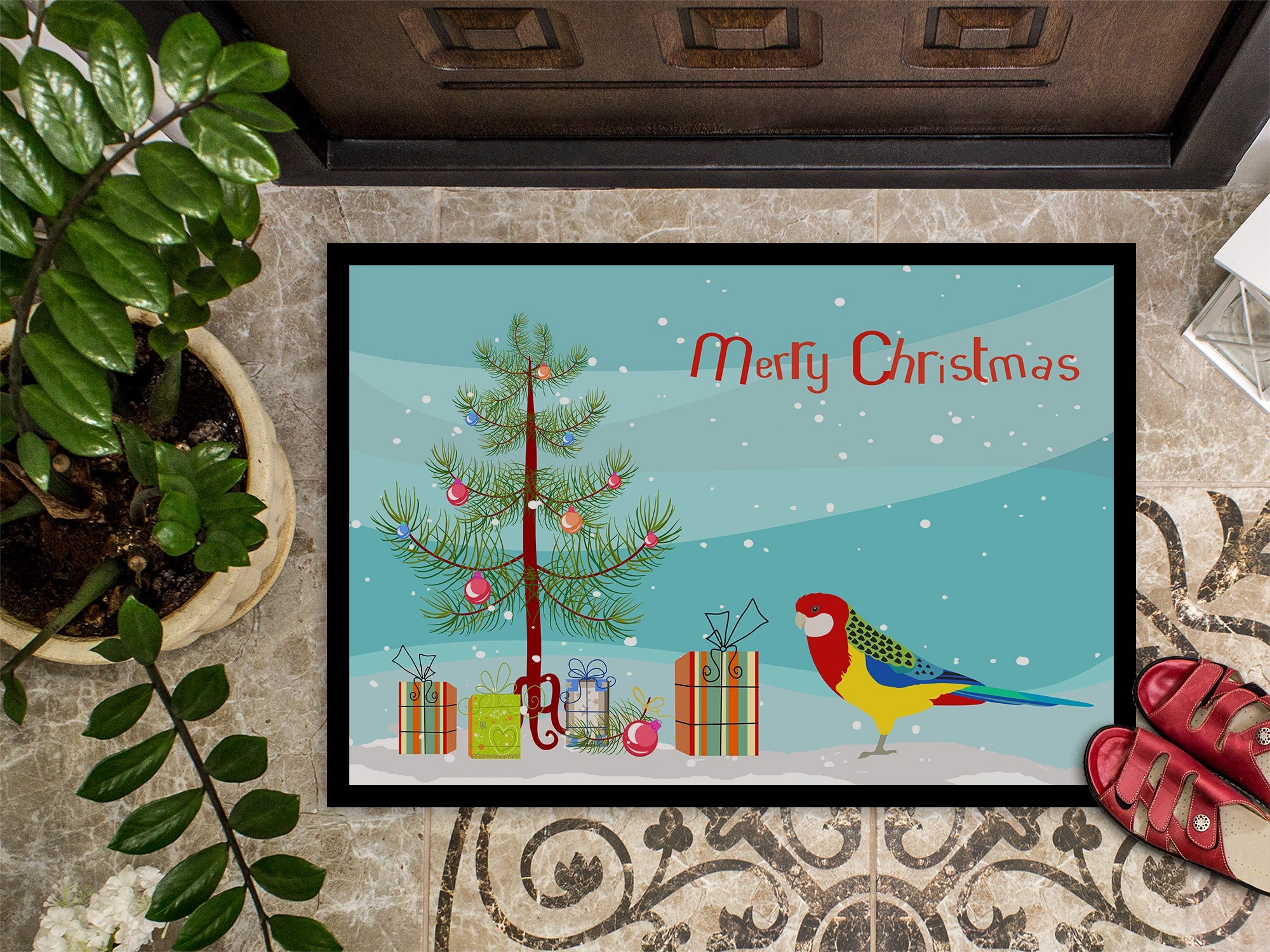 Decorate your space with our Christmas Rosella artwork on a Doormat. Welcome your guests in style with our Artwork Door Mat, designed to withstand almost any weather condition. This mat, measuring approximately 18 by 27 inches, is held together by durable black binding tape. Its top layer, composed of polyester felt, is dyed with the eye-catching image you see on the mat. A few layers below provide the mat with stability, while its rubber bottom is stamped to help prevent slipping and ensures safety. Our mat works wonderfully as both an indoor or outdoor door mat. For cleaning, simply hose it off with water or use a power washer - no need for any cleaner that produces suds. Avoid scrubbing with a brush, instead, opt for the vacuum on floor setting. Designed manufactured and printed in the USA, this mat is a perfect addition to your porch, outdoor kitchen, entryway, or any indoor space. Its unique design makes it a charming decorative rug that greets your guests and adds a stylish touch to your home decor.