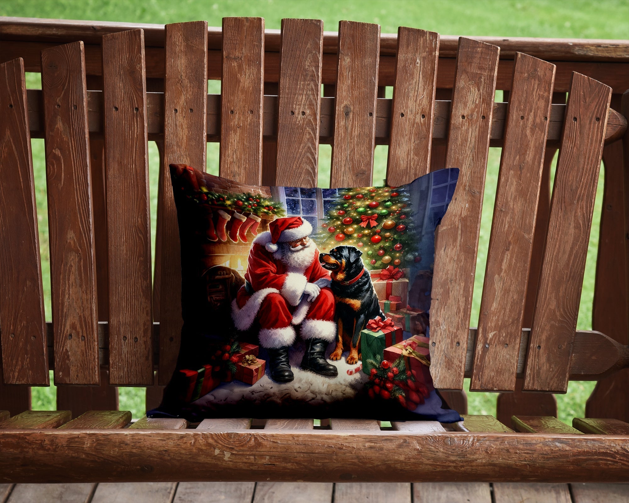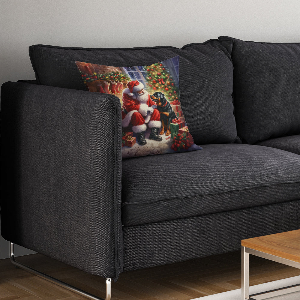 Throw Pillow featuring breed specific Rottweiler artwork. Celebrate Christmas with this Christmas Pillow. Add a touch of vibrancy and comfort to your outdoor seating with Caroline's Treasures Fabric Decorative Pillow. Measuring approximately 14 inches by 14 inches, this outdoor pillow is crafted to elevate the appeal of your patio furniture, infusing it with vivid color and artistic flair. The pillow includes a 100% Polyester Fabric sham filled with a quality pillow form to provide superior comfort. Innovatively made from our brand new material, specifically woven for its water resistance, this pillow is designed for durability. The soft canvas fabric offers versatility in use, fit for your indoor couch or your outdoor patio, porch, or veranda. The fabric is dyed with colorfast dyes built for resilience against weather conditions, ensuring the pillow retains its beauty over time. Constructed by sewing three fabric pieces to create a sham, the polyester insert is then nestled inside to form the pillow, resulting in an overstuffed pillow that maintains its shape. Both the sham and the pillow insert are proudly made in the United States. As the pillows are handcrafted, there may be minor variations in size, further enhancing their unique charm. Experience comfort in style with Caroline's Treasures Fabric Decorative Pillow.