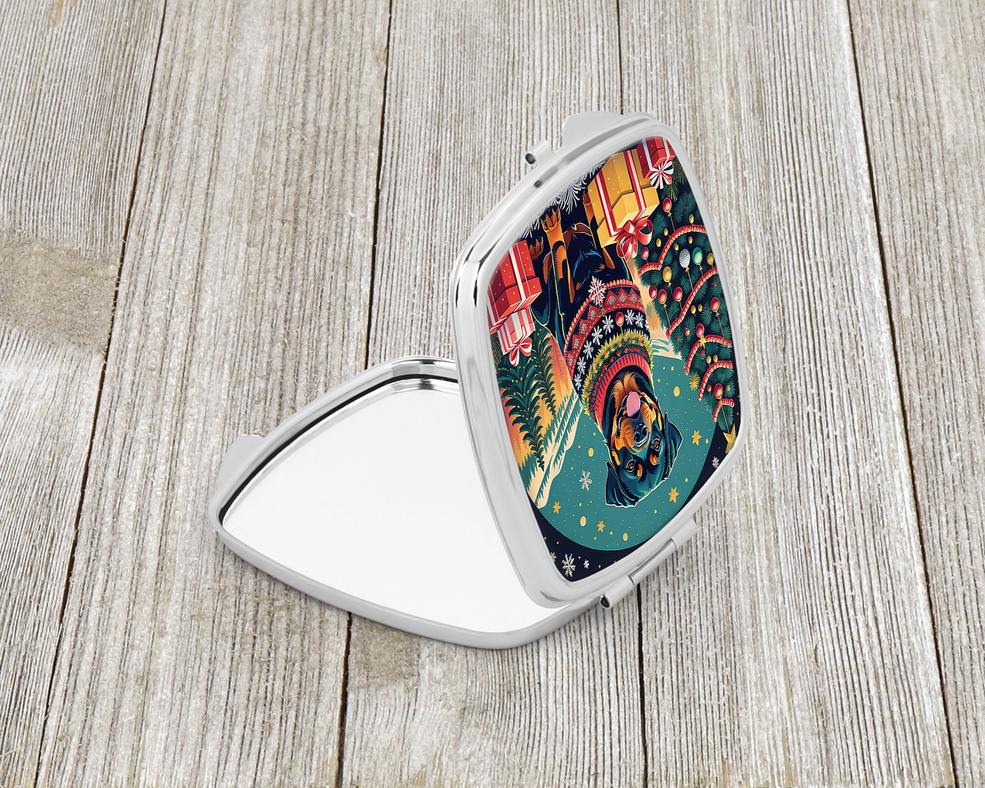 Decorate your space with our Christmas Rottweiler artwork on a Compact Mirror. Introducing our Square Compact Mirror, a blend of elegance, functionality, and compactness, perfect for on-the-go touch-ups. This Silvertone metal mirror, with dimensions of 2.75 inches x 3 inches x .3 inches, fits effortlessly into your purse, handbag, or pocket, ensuring that you can check your appearance anytime, anywhere. Our compact mirror stands out with its eye-catching artwork on the front, adding a dash of style to this practical accessory. It is more than just a mirror; it's a statement piece that reflects your personality and aesthetic. When opened, this compact reveals two mirrors inside, doubling your perspective for precise touch-ups. The Silvertone metal construction ensures durability while maintaining a lightweight feel, making it an ideal everyday carry item. Whether you're rushing to a meeting, prepping for a dinner date, or just need a quick check on your look, our Square Compact Mirror is your reliable companion. Experience the perfect blend of style and practicality with this must-have accessory.