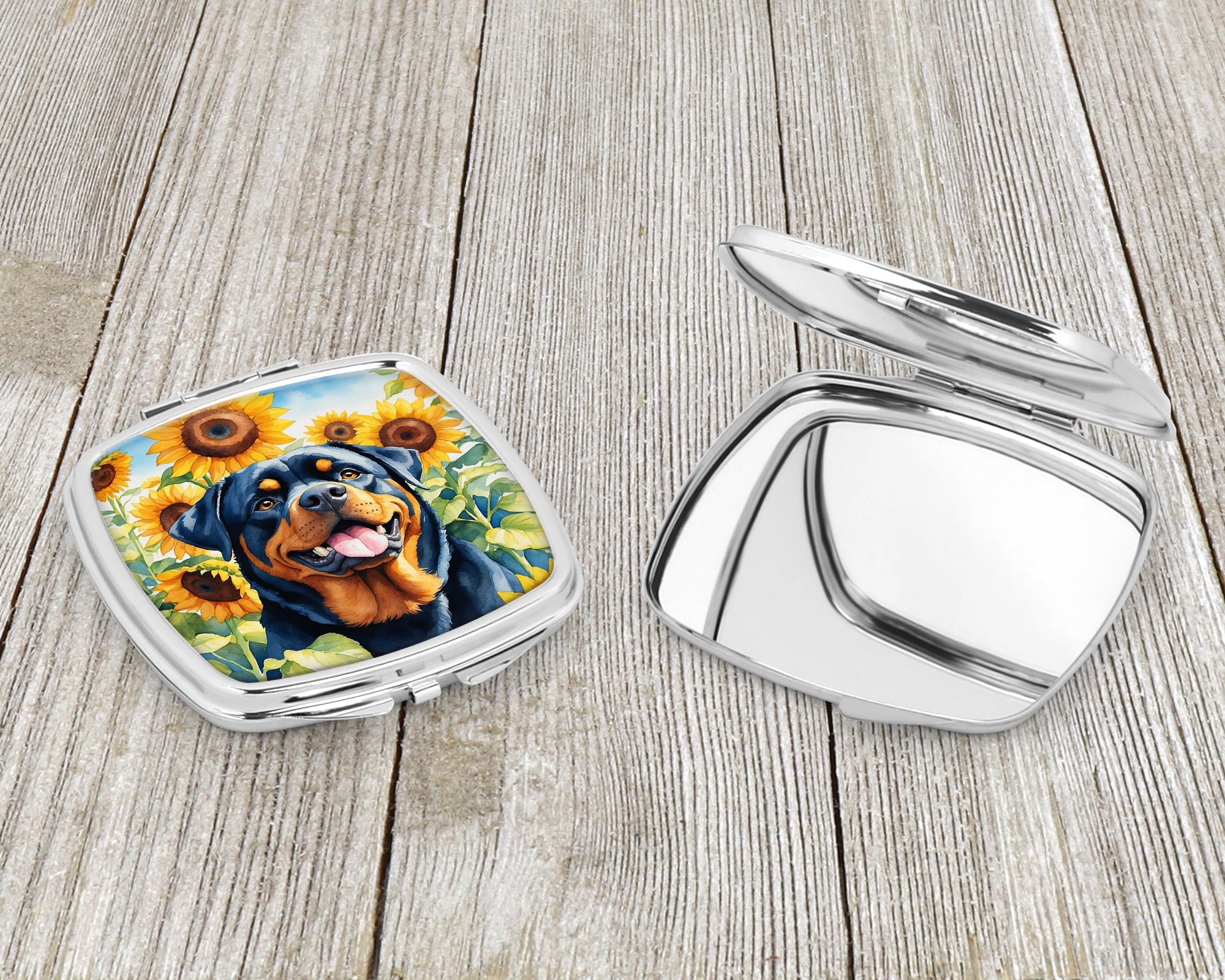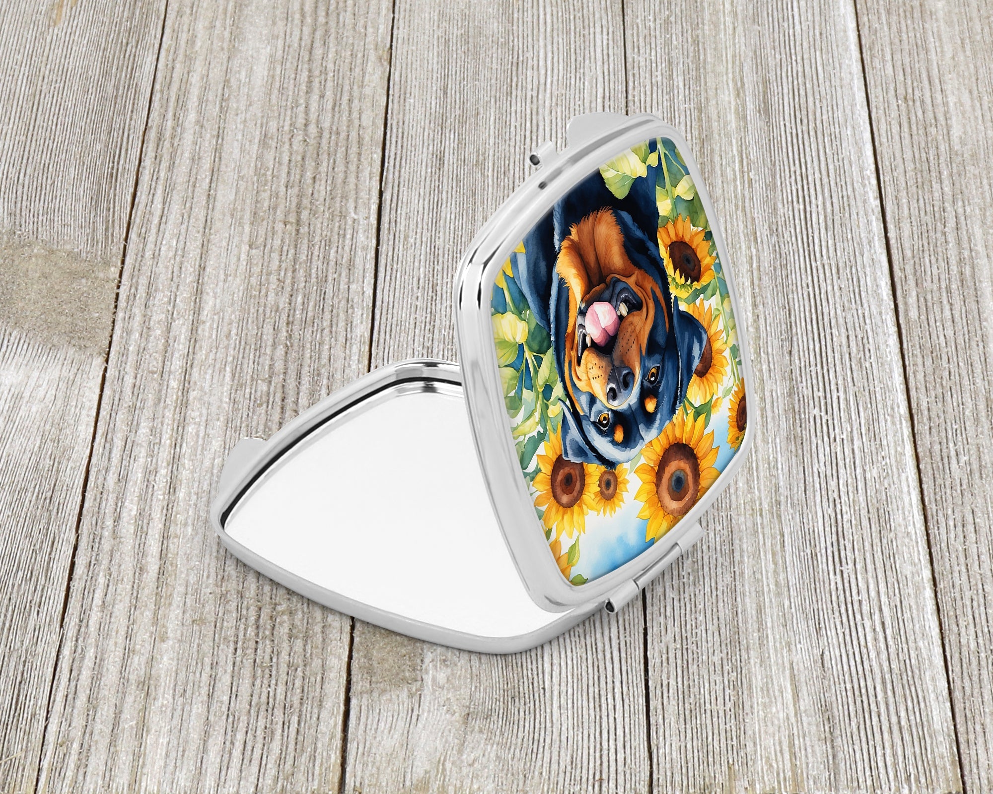 Decorate your space with our Rottweiler artwork on a Compact Mirror. Bring a bit of Summer into your home with a Summer Compact Mirror. Introducing our Square Compact Mirror, a blend of elegance, functionality, and compactness, perfect for on-the-go touch-ups. This Silvertone metal mirror, with dimensions of 2.75 inches x 3 inches x .3 inches, fits effortlessly into your purse, handbag, or pocket, ensuring that you can check your appearance anytime, anywhere. Our compact mirror stands out with its eye-catching artwork on the front, adding a dash of style to this practical accessory. It is more than just a mirror; it's a statement piece that reflects your personality and aesthetic. When opened, this compact reveals two mirrors inside, doubling your perspective for precise touch-ups. The Silvertone metal construction ensures durability while maintaining a lightweight feel, making it an ideal everyday carry item. Whether you're rushing to a meeting, prepping for a dinner date, or just need a quick check on your look, our Square Compact Mirror is your reliable companion. Experience the perfect blend of style and practicality with this must-have accessory.