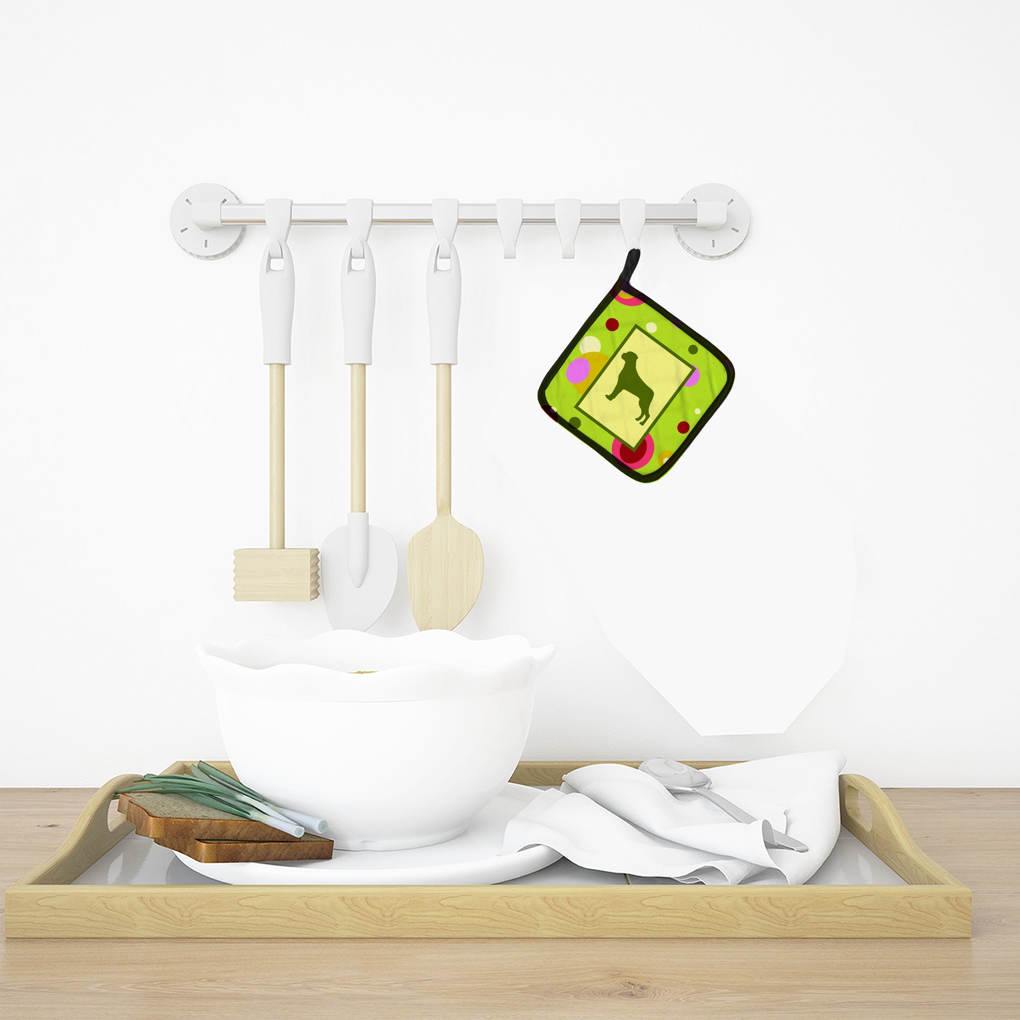 Decorate your space with our Rottweiler artwork on a Pair of Pot Holders. A Pair of Pot Holders to match your kitchen decor. Made in the USA these are thick and functional. Full color artwork decorates the front polyester fabric of the hot pad and accented by a black trim. Use these at as a trivet for your Thanksgiving or Christmas tablescape. Filled with insulated fabric and quilted for durability. These colorful pot holders will make a great gift for your favorite home cook or executive chef. Each pot holder measures approximately 7 1/2 inches by 7 1/2 inches. A hanging tab is included.