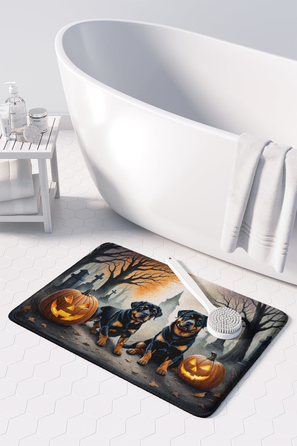 Decorate your space with our Halloween Rottweiler artwork on a Floor Mat. Transform your floor into a work of art with Caroline's Treasures' Memory Foam Mat. This mat offers not only a stunning visual appeal but also a luxurious, plush feel that's incredibly comfortable to the touch. It's a versatile, machine-washable mat designed for both bath and kitchen use, ensuring you experience the best in comfort and convenience. Care Instructions: Maintaining this memory foam mat is a breeze. Simply follow the care instructions on the product tag. It's recommended to wash in cold water and dry on a low-temperature setting in the dryer. This ensures the mat retains its quality and longevity, allowing you to enjoy its beauty and comfort for a long time. Caroline's Treasures' Memory Foam Mat Machine Washable is the perfect blend of artistry, comfort, and practicality, making it a standout addition to any space. Upgrade your home decor with this versatile and stylish mat today.