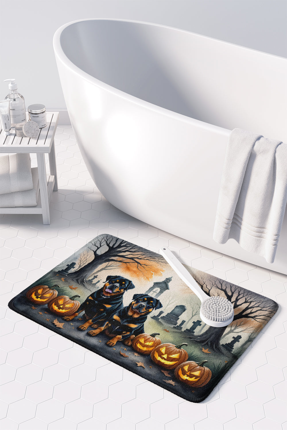 Decorate your space with our Halloween Rottweiler artwork on a Floor Mat. Transform your floor into a work of art with Caroline's Treasures' Memory Foam Mat. This mat offers not only a stunning visual appeal but also a luxurious, plush feel that's incredibly comfortable to the touch. It's a versatile, machine-washable mat designed for both bath and kitchen use, ensuring you experience the best in comfort and convenience. Care Instructions: Maintaining this memory foam mat is a breeze. Simply follow the care instructions on the product tag. It's recommended to wash in cold water and dry on a low-temperature setting in the dryer. This ensures the mat retains its quality and longevity, allowing you to enjoy its beauty and comfort for a long time. Caroline's Treasures' Memory Foam Mat Machine Washable is the perfect blend of artistry, comfort, and practicality, making it a standout addition to any space. Upgrade your home decor with this versatile and stylish mat today.