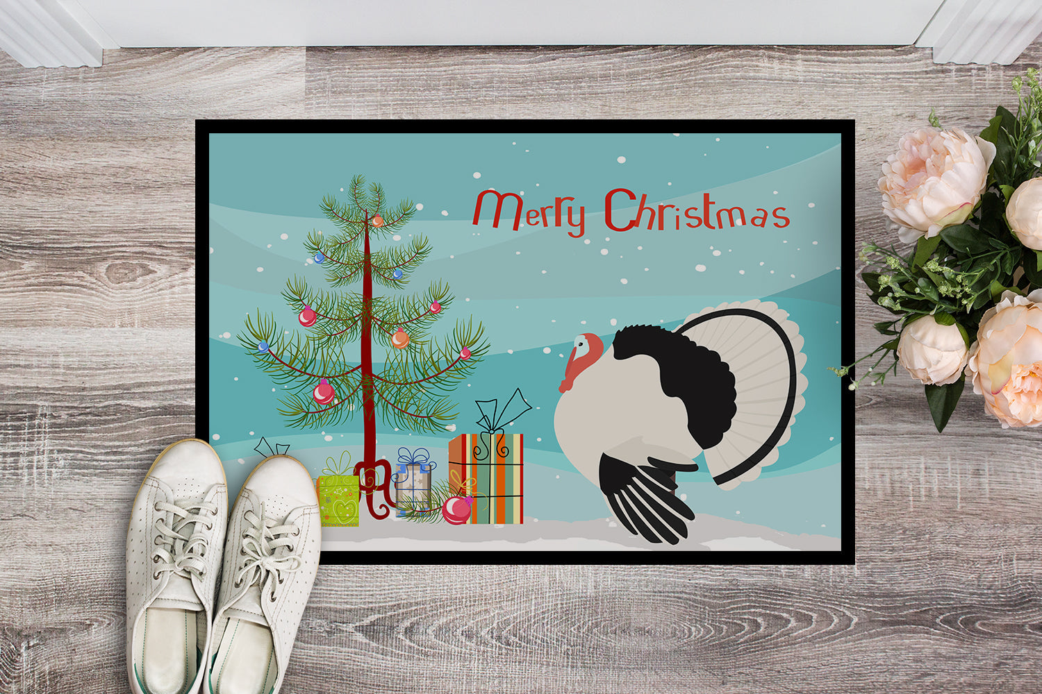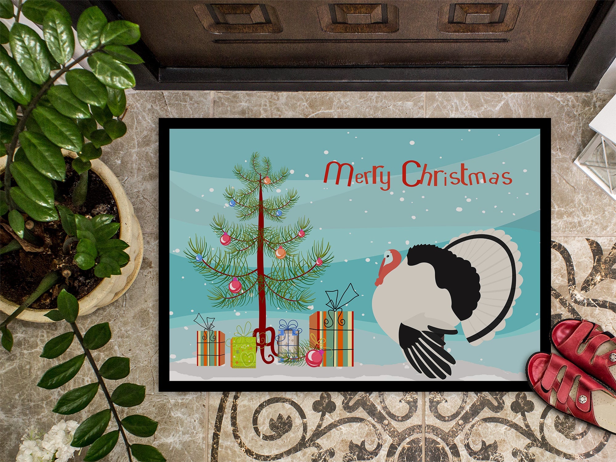 Decorate your space with our Christmas Royal Palm Turkey artwork on a Doormat. Welcome your guests in style with our Artwork Door Mat, designed to withstand almost any weather condition. This mat, measuring approximately 24 by 36 inches, is held together by durable black binding tape. Its top layer, composed of polyester felt, is dyed with the eye-catching image you see on the mat. A few layers below provide the mat with stability, while its rubber bottom is stamped to help prevent slipping and ensures safety. Our mat works wonderfully as both an indoor or outdoor door mat. For cleaning, simply hose it off with water or use a power washer - no need for any cleaner that produces suds. Avoid scrubbing with a brush, instead, opt for the vacuum on floor setting. Designed manufactured and printed in the USA, this mat is a perfect addition to your porch, outdoor kitchen, entryway, or any indoor space. Its unique design makes it a charming decorative rug that greets your guests and adds a stylish touch to your home decor.