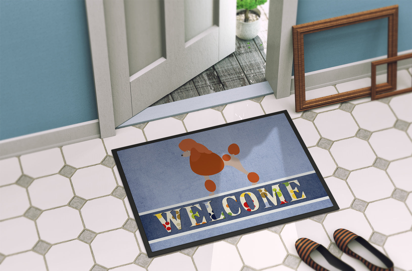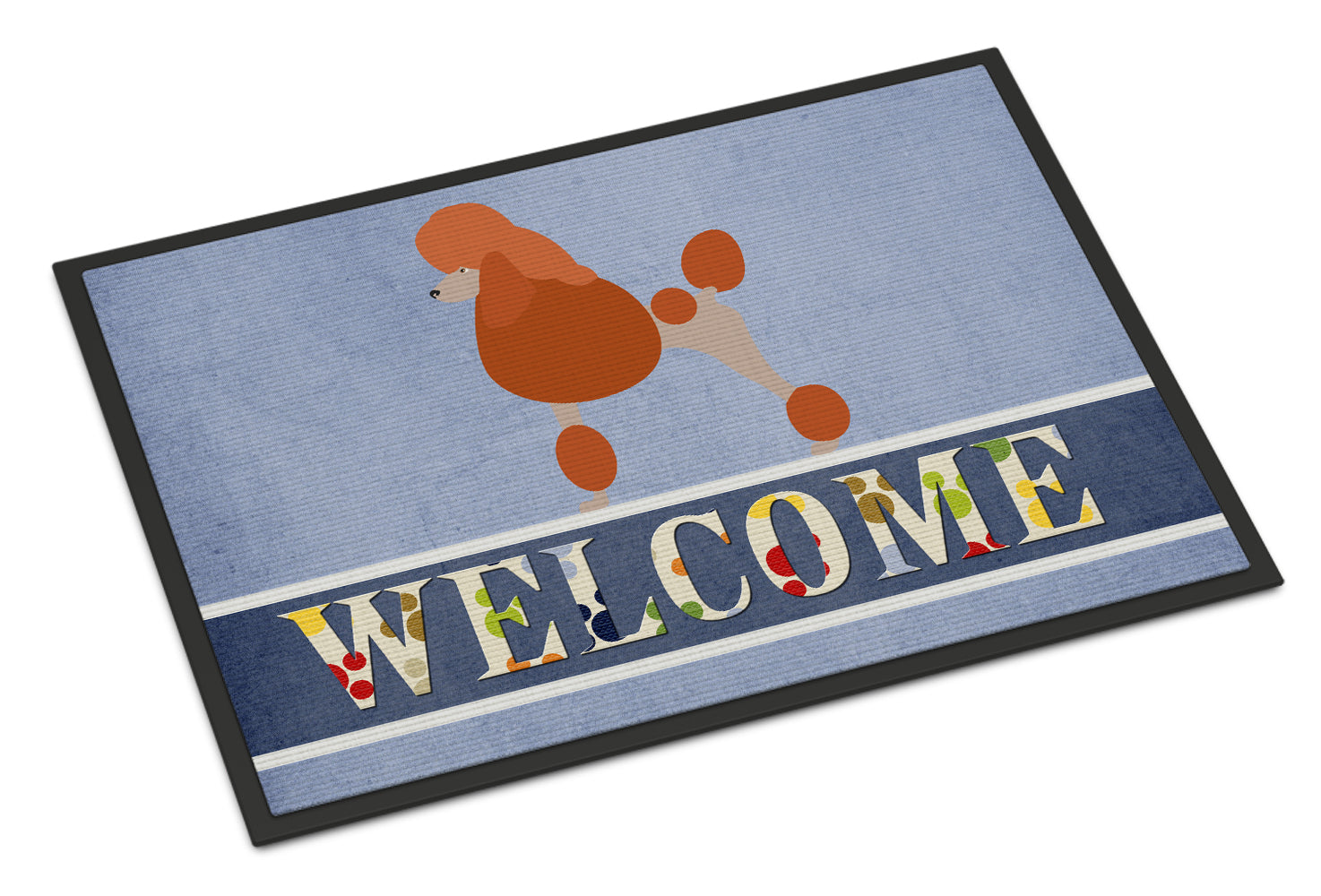 Decorate your space with our Poodle artwork on a Doormat. Welcome your guests in style with our Artwork Door Mat, designed to withstand almost any weather condition. This mat, measuring approximately 18 by 27 inches, is held together by durable black binding tape. Its top layer, composed of polyester felt, is dyed with the eye-catching image you see on the mat. A few layers below provide the mat with stability, while its rubber bottom is stamped to help prevent slipping and ensures safety. Our mat works wonderfully as both an indoor or outdoor door mat. For cleaning, simply hose it off with water or use a power washer - no need for any cleaner that produces suds. Avoid scrubbing with a brush, instead, opt for the vacuum on floor setting. Designed manufactured and printed in the USA, this mat is a perfect addition to your porch, outdoor kitchen, entryway, or any indoor space. Its unique design makes it a charming decorative rug that greets your guests and adds a stylish touch to your home decor.