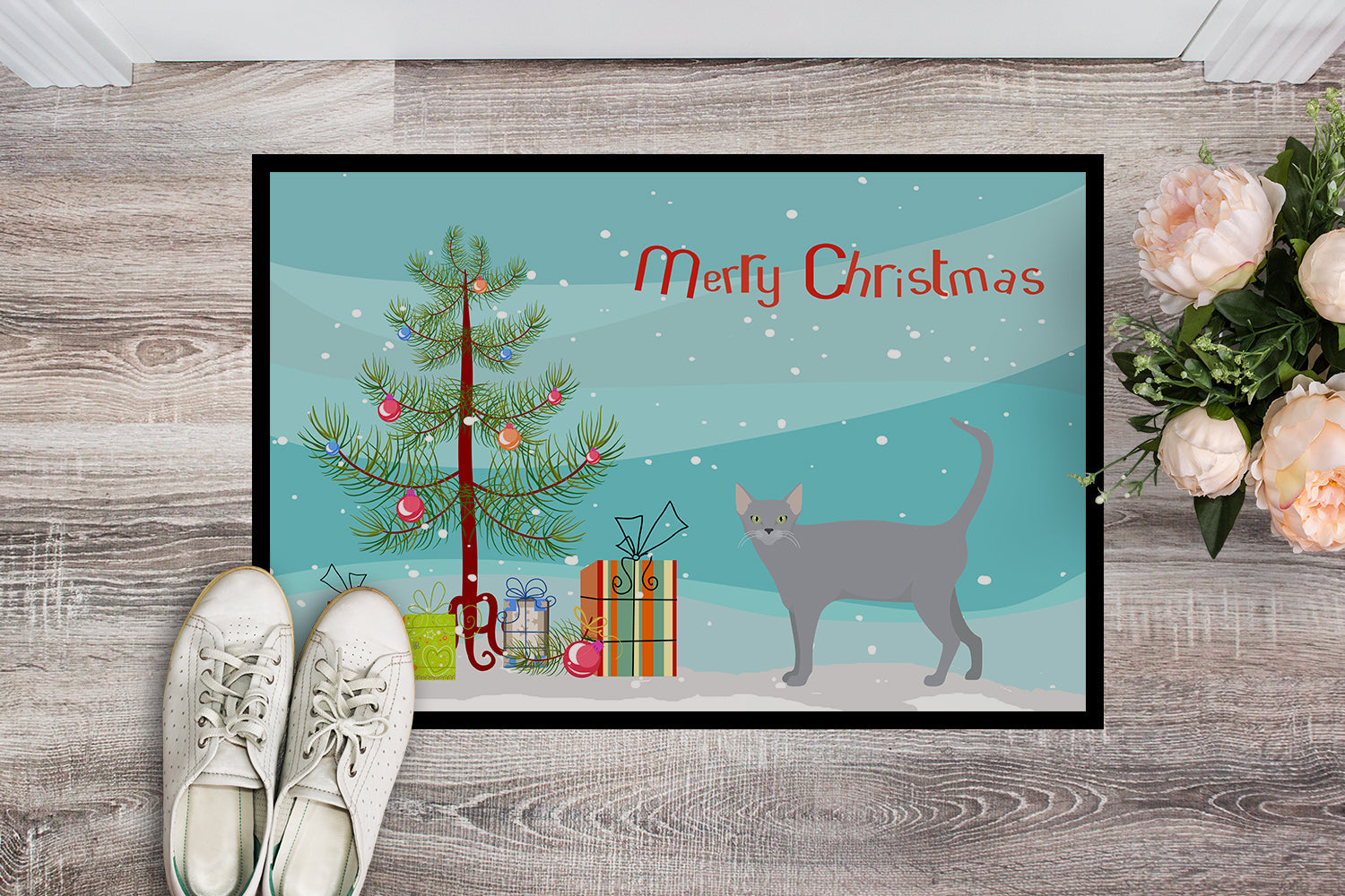 Decorate your space with our Christmas Russian Blue artwork on a Doormat. Welcome your guests in style with our Artwork Door Mat, designed to withstand almost any weather condition. This mat, measuring approximately 24 by 36 inches, is held together by durable black binding tape. Its top layer, composed of polyester felt, is dyed with the eye-catching image you see on the mat. A few layers below provide the mat with stability, while its rubber bottom is stamped to help prevent slipping and ensures safety. Our mat works wonderfully as both an indoor or outdoor door mat. For cleaning, simply hose it off with water or use a power washer - no need for any cleaner that produces suds. Avoid scrubbing with a brush, instead, opt for the vacuum on floor setting. Designed manufactured and printed in the USA, this mat is a perfect addition to your porch, outdoor kitchen, entryway, or any indoor space. Its unique design makes it a charming decorative rug that greets your guests and adds a stylish touch to your home decor.