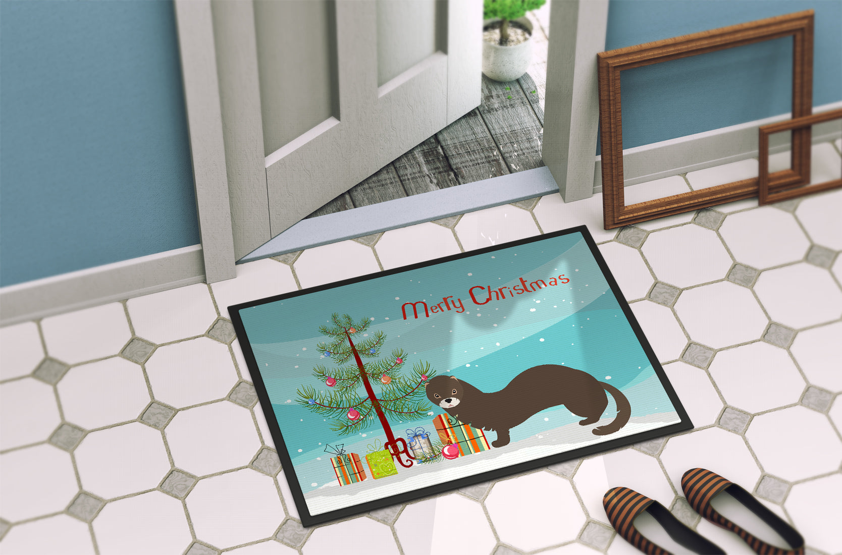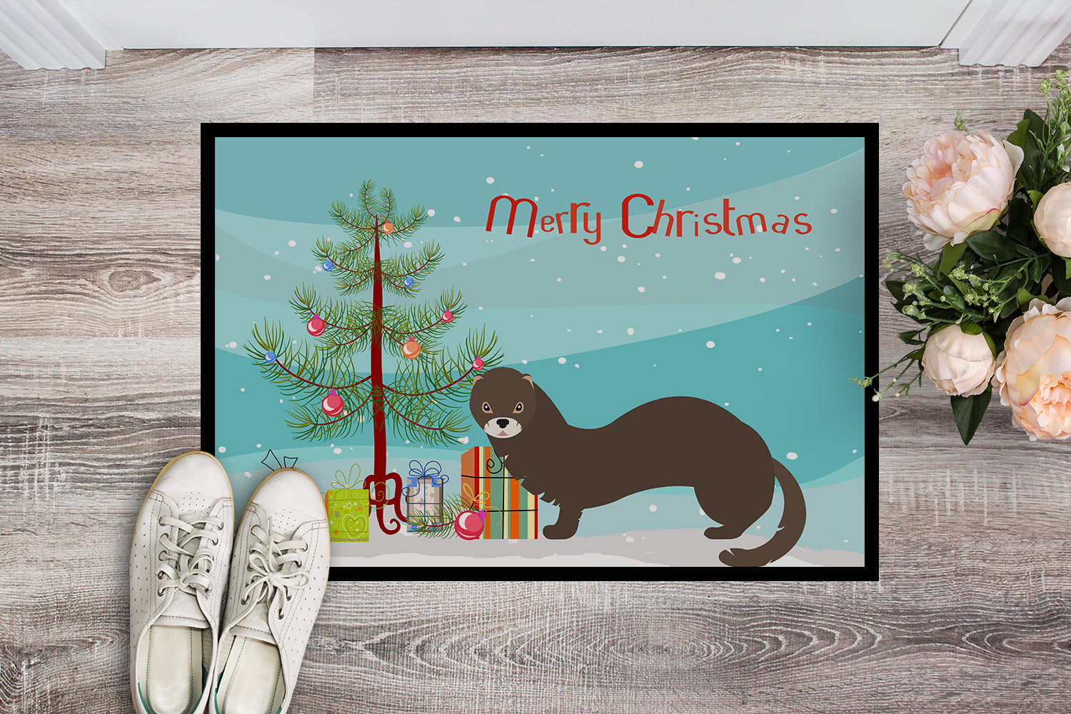 Decorate your space with our Christmas Russian or European Mink artwork on a Doormat. Welcome your guests in style with our Artwork Door Mat, designed to withstand almost any weather condition. This mat, measuring approximately 24 by 36 inches, is held together by durable black binding tape. Its top layer, composed of polyester felt, is dyed with the eye-catching image you see on the mat. A few layers below provide the mat with stability, while its rubber bottom is stamped to help prevent slipping and ensures safety. Our mat works wonderfully as both an indoor or outdoor door mat. For cleaning, simply hose it off with water or use a power washer - no need for any cleaner that produces suds. Avoid scrubbing with a brush, instead, opt for the vacuum on floor setting. Designed manufactured and printed in the USA, this mat is a perfect addition to your porch, outdoor kitchen, entryway, or any indoor space. Its unique design makes it a charming decorative rug that greets your guests and adds a stylish touch to your home decor.