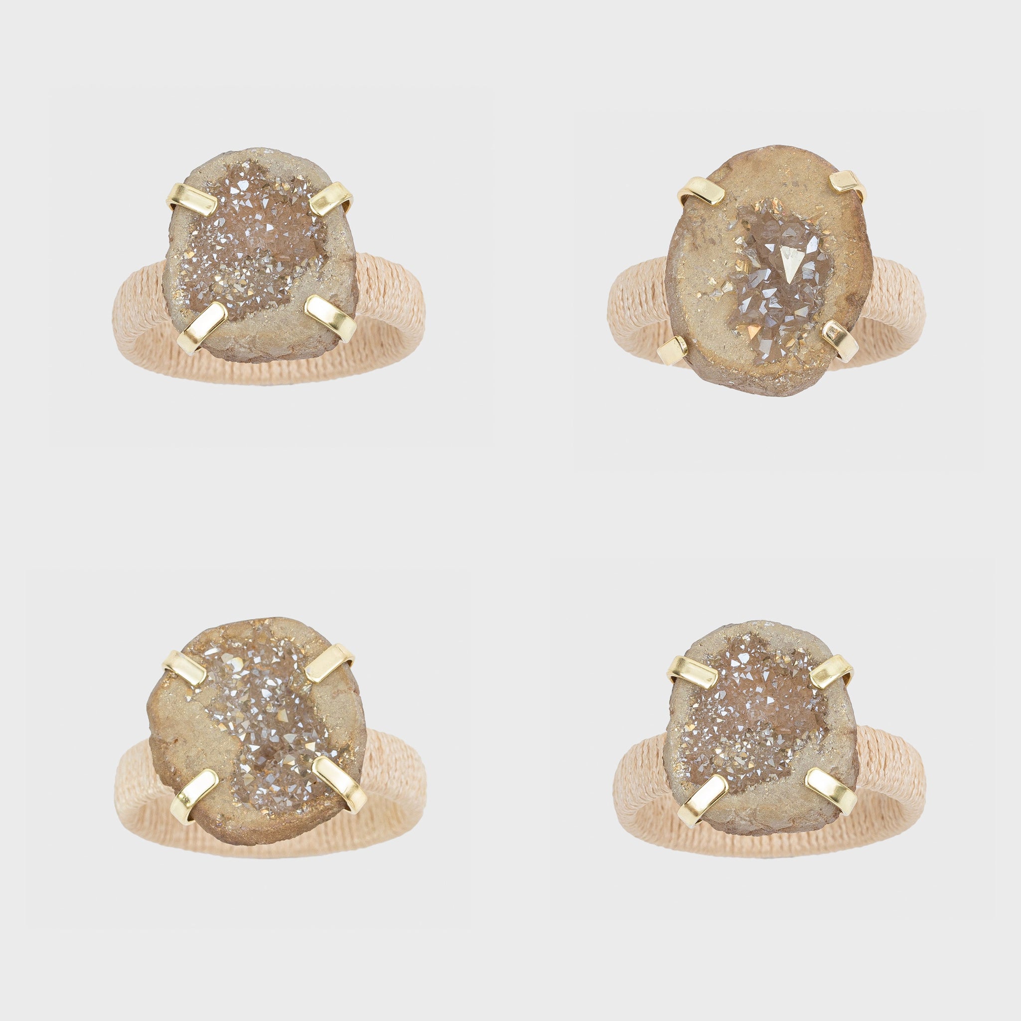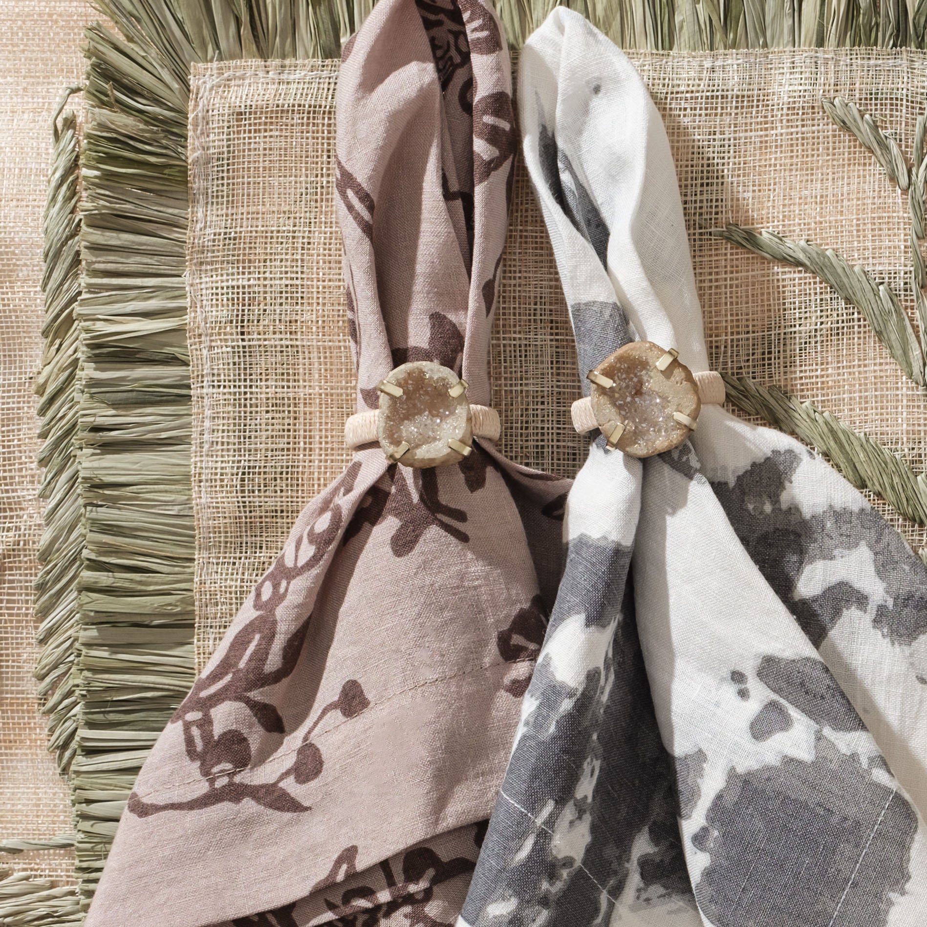These napkin rings with real druzy stones paired with a natural, wrapped raffia band are simply exquisite. I love these for beach dining or for a natural element in a super modern setting. These napkin rings are perfect with neutral table linens all year round. Luxury rustic meets organic sparkle!