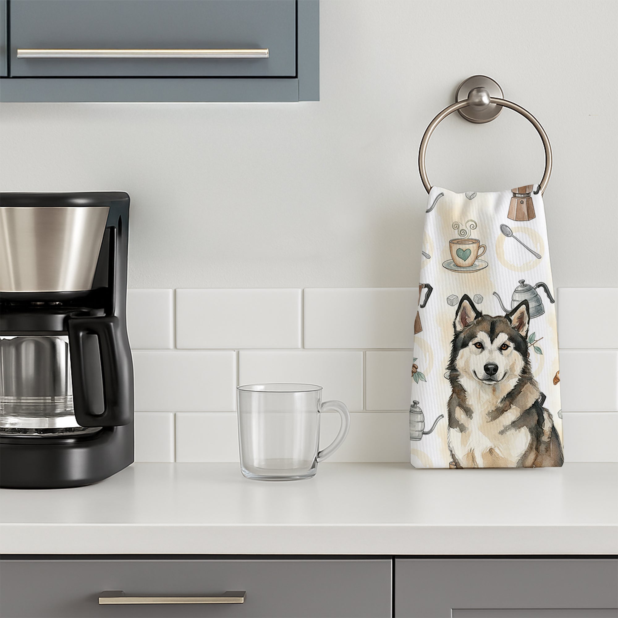 Kitchen Towel featuring breed specific Alaskan Malamute artwork. Start your morning with charm and function thanks to our Coffee Time Kitchen Towel Collection. Featuring playful watercolor artwork of coffee pots, cups, croissants, and a dog portrait, these towels bring warmth and personality to your kitchen or bath. Crafted with a plush minky polyester front that polishes glassware to a shine, and a 100% cotton terry loop back for absorbency, they combine durability with practicality. Artwork is permanently dyed into the fibers to keep colors fresh wash after wash. Measuring 15" x 25", these machine-washable towels are finished with bound edges to hold their shape. Designed and printed in the USA, they’re perfect for kitchens, coffee bars, guest baths, or as thoughtful gifts for dog lovers and coffee enthusiasts alike.