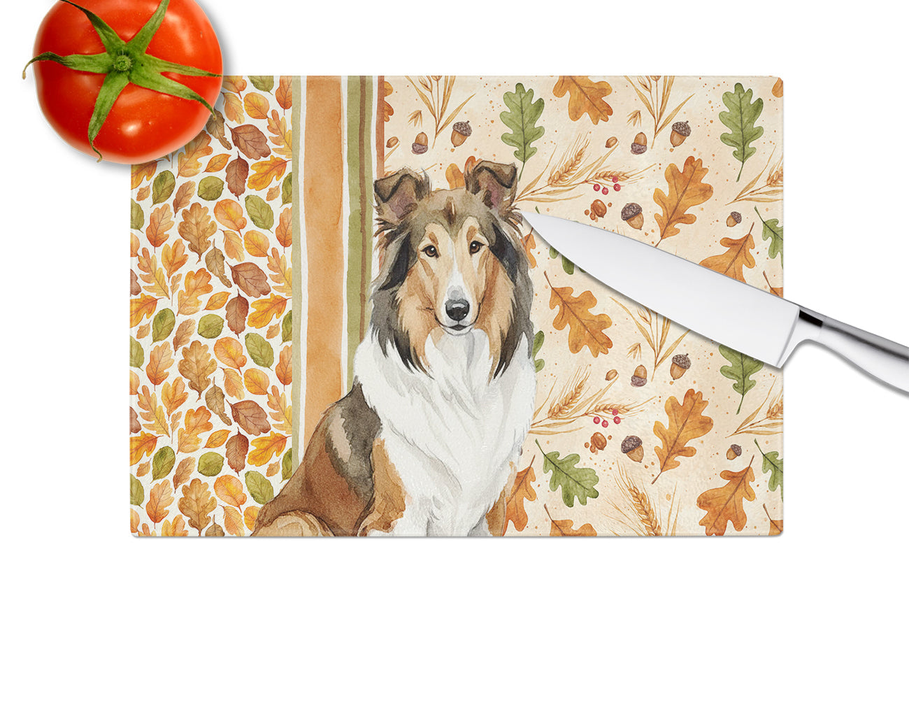 Glass Cutting Board featuring breed specific Collie artwork. Celebrate Thanksgiving with this Thanksgiving Cutting Board. Introduce your kitchen to the vibrant, large Decorative Glass Cutting Board from Caroline's Treasures. Crafted from resilient tempered glass, this board is not only a utilitarian necessity but also a colorful art piece. With its generous dimensions of 15 inches in height and 12 inches in length, it offers ample space for all your cutting needs. Every piece showcases captivating artwork from distinguished artists, bringing an aesthetic edge to your kitchen. Beyond its attractive design, this cutting board ensures your countertop stays pristine and unscathed, owing to its heat-resistant properties. Engineered with user convenience in mind, it features non-skid feet for stability, and rounded corners for additional safety. Its robust construction renders it virtually unbreakable, guaranteeing longevity. The board comes with protective feet bumpers, maintaining its position during use. This product is recommended to be hand washed only. Proudly printed and assembled in the United States, this cutting board exemplifies superior craftsmanship. With Caroline's Treasures' Decorative Glass Cutting Board, you're investing in a blend of functionality and artistic flair.