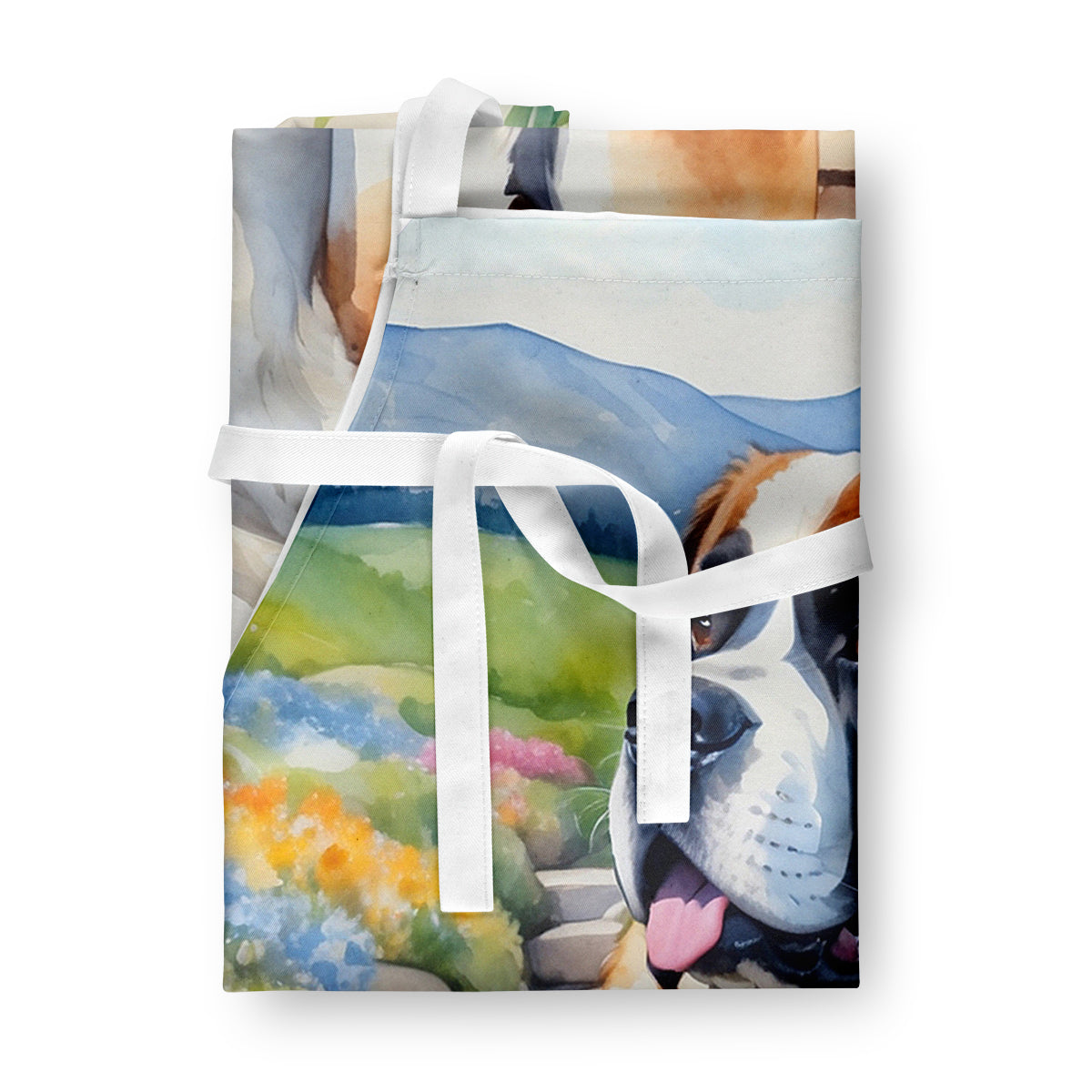 Decorate your space with our Saint Bernard artwork on a Apron. Bring a bit of Spring into your home with a Spring Apron. Elevate your cooking, baking, and grilling experiences with our versatile Kitchen or BBQ Apron. This Bib Style apron isn't just limited to culinary activities - it also serves as an excellent baking apron, artist apron, server apron, gardening apron, or even a dog grooming apron. The apron showcases vibrant full-color artwork contributed by one of our talented artists, bringing a dash of style to your daily tasks. With dimensions of approximately 27"W x 30"H, it provides ample coverage to protect your clothing from spills and splashes. Our apron is meticulously crafted from 100% Ultra Spun Polyester, known for its durability and lightweight nature. The apron comes with white tie straps, ensuring a comfortable and adjustable fit for all. It's a perfect choice for kitchen apron enthusiasts, whether you are a woman or a man. Designed for easy maintenance, this apron is fully machine washable. The quick-drying polyester material actively reduces staining, keeping your apron looking fresh and new for longer. Our beautifully designed apron isn't just a functional kitchen accessory - it's a fashion statement in the culinary world!