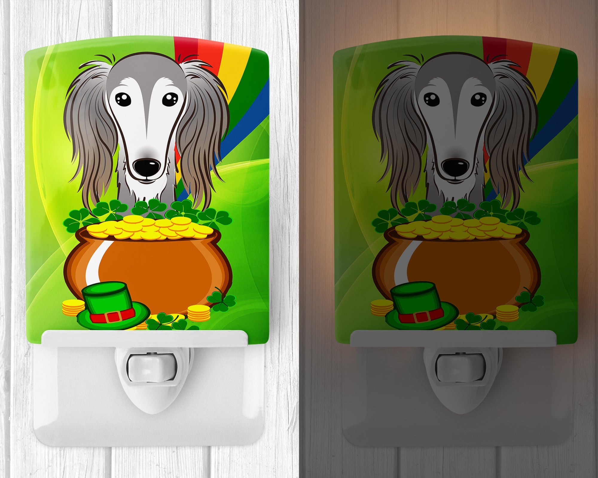 Decorate your space with our St Patrick's Day Saluki artwork on a Night Light. Introduce a splash of artistic flair and subtle illumination to your space with the Decorative Ceramic Night Light from Caroline's Treasures. Perfect for any room, this night light seamlessly blends functionality with an aesthetic appeal, offering a stylish solution to brighten up dark corners of your home or office. Boasting a six-inch high by four-inch wide ceramic tile at the front, it showcases vivid, full-color artwork from distinguished artists, transforming a simple utility into a vibrant art piece. The artwork is securely encased in a robust metal holder, ensuring durability and longevity. Two screws are provided to firmly affix the tile into the holder. The holder extends three inches deep, housing an included bulb that emits a soft, welcoming glow. This product meets all safety standards, as evidenced by its UL approval. Proudly made in the United States from imported components, this Decorative Ceramic Night Light is not just a functional device; it's a statement piece that enhances the ambiance of your surroundings.