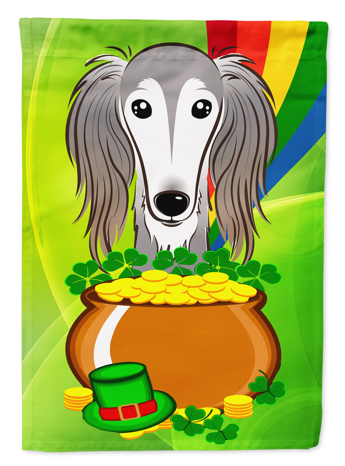 Decorate your space with our St Patrick's Day Saluki artwork on a Garden Flag. Enhance the beauty of your garden, patio, or yard with Caroline's Treasures Decorative Garden Flag, proudly made in the USA. Crafted from two pieces of thick, double-sided polyester fabric, this 2-ply garden flag is designed to withstand various weather conditions, making it water-resistant and weatherproof. Featuring correctly readable words on both sides, this garden flag offers a delightful visual experience from any angle. With its heavier weight, it stands out among other garden flags, ensuring stability and durability even in wind, rain, and snow. Measuring approximately 11 1/4 inches by 15 1/2 inches, this flag allows you to personalize your outdoor decor. It comes with a 1 1/2-inch sleeve sewn in, allowing easy attachment to any standard garden flag stand or garden size porch hanger (sold separately). Make a statement in your outdoor space with Caroline's Treasures Decorative Garden Flag, a vibrant and high-quality flag that adds color and personality to your surroundings. Proudly made in the USA, it's a symbol of quality craftsmanship and attention to detail.