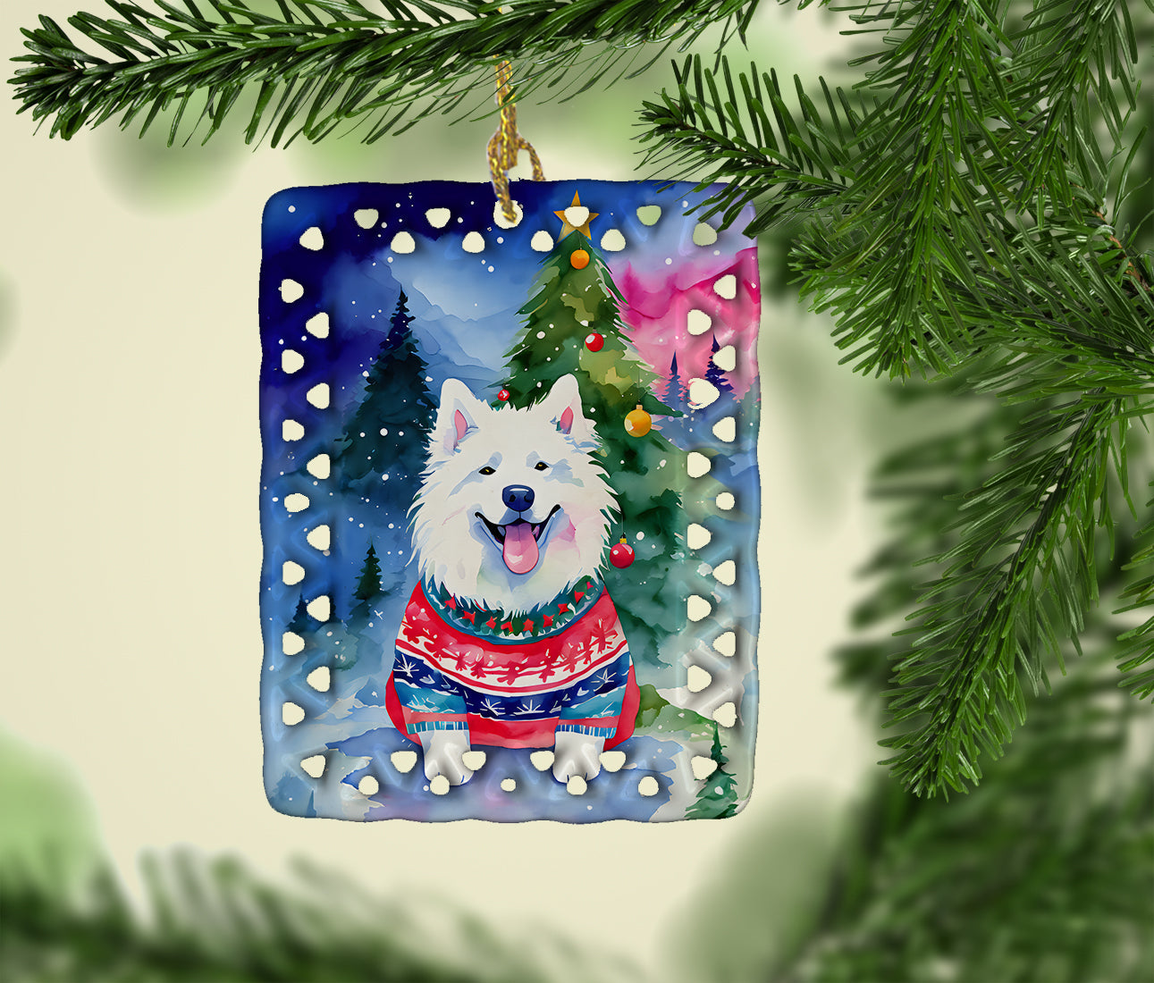 Porcelain Ornament featuring breed specific Samoyed artwork. Celebrate Christmas with this Christmas Ornament. Add a unique, personal touch to your holiday decor with our Rectangular Lattice Porcelain Ornament. Perfect for creating cherished memories, this high-quality ornament shines under festive lights, reflecting warmth and joy throughout your Christmas tree. Crafted with a glossy finish, it showcases vibrant, full-color artwork contributed by our talented artists, ensuring your tree is adorned with a burst of color and holiday spirit. What sets this Porcelain Ornament apart is its customizable white back. Use a paint pen or permanent marker to write a heartfelt message, commemorate a special year, or mark an unforgettable date, turning this ornament into a keepsake that will be treasured for years to come. For best results, allow any personalization to dry thoroughly before handling. Each ornament comes complete with a delicate gold cord, making it easy to hang and display. Proudly made in the USA, this ornament measures 3.375 x 2.625 inches and is a thoughtful gift for pet sitters, teachers, family members, or anyone who would appreciate a little extra holiday magic. Bring style, charm, and a touch of personal meaning to your Christmas tree with this beautifully designed ornament..