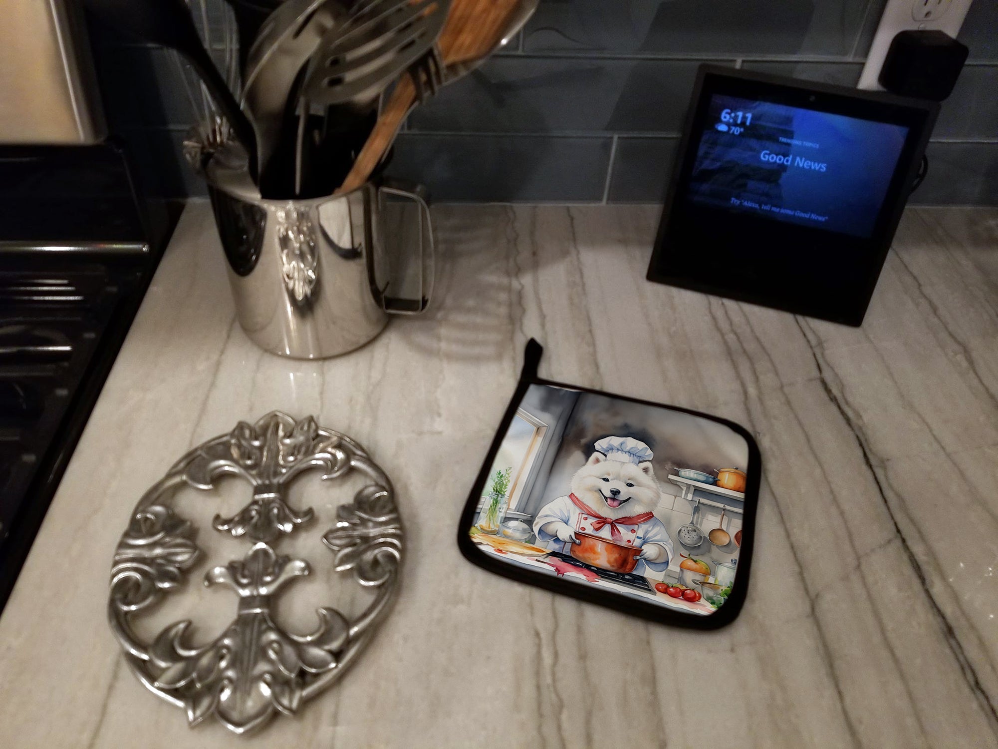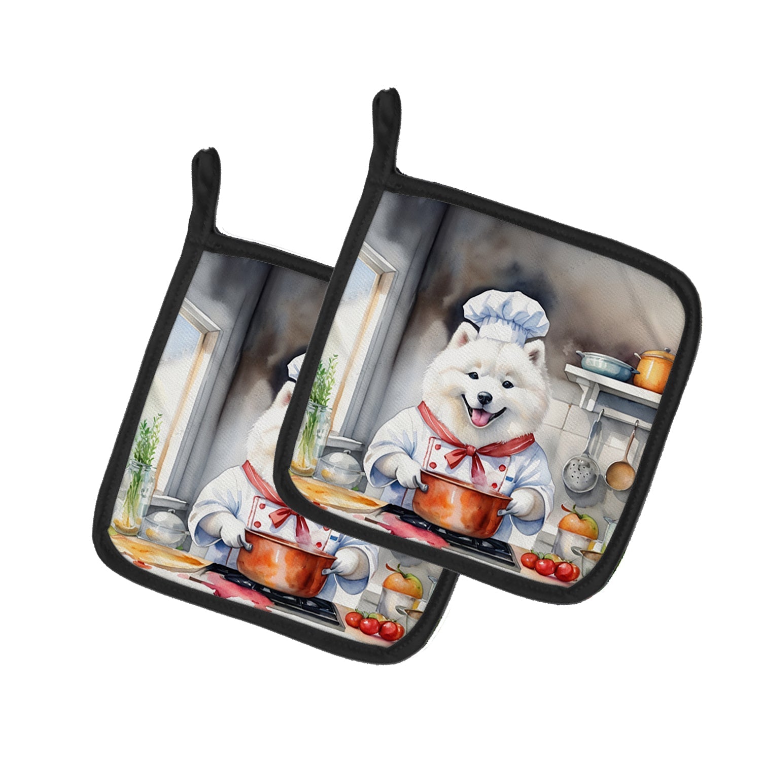 Decorate your space with our Samoyed artwork on a Pair of Pot Holders. A Pair of Pot Holders to match your kitchen decor. Made in the USA these are thick and functional. Full color artwork decorates the front polyester fabric of the hot pad and accented by a black trim. Use these at as a trivet for your Thanksgiving or Christmas tablescape. Filled with insulated fabric and quilted for durability. These colorful pot holders will make a great gift for your favorite home cook or executive chef. Each pot holder measures approximately 7 1/2 inches by 7 1/2 inches. A hanging tab is included.