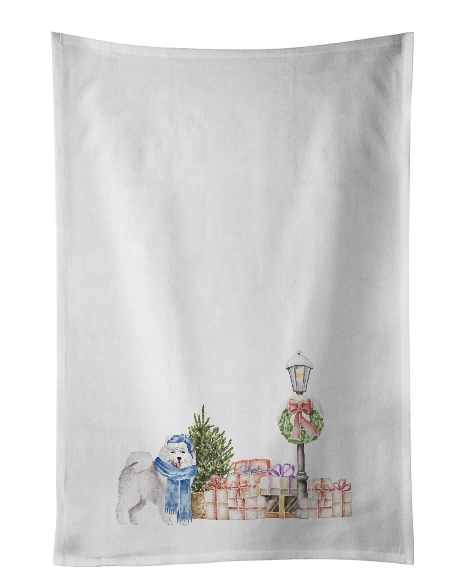 Decorate your space with our Christmas Samoyed artwork on a Kitchen Cotton Towels. Spruce up your kitchen decor with Caroline's Treasures Decorative White Kitchen Towel Set. This set of two dish towels showcases beautiful artwork from one of our talented artists, making them both practical and visually appealing. These towels are crafted from 100% cotton, offering excellent absorbency and durability, making them ideal for any kitchen task. Each white towel measures 19 inches by 28 inches, providing ample coverage for drying dishes or wiping up spills. The standout feature of these towels is the full-color artwork design printed on each one. They can serve as a vibrant accent in your kitchen, turning a functional item into a delightful piece of decor. When it comes to care, these towels are machine washable in cold water and can be dried on low heat. Remember to always use a pressing cloth when pressing the design, and avoid using bleach on the decorated towel. The Decorative White Kitchen Towel Set makes a great gift or a stylish addition to your own kitchen.