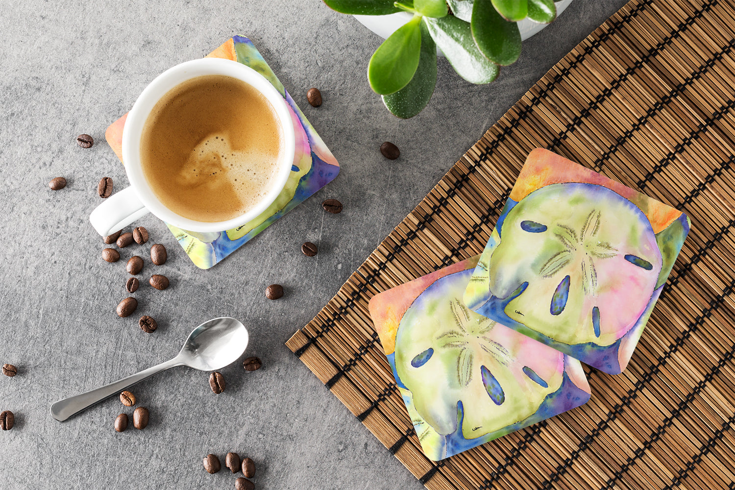 Decorate your space with our Sand Dollar artwork on a Coaster set. Presenting our Set of 4 Foam Coasters, a stylish and practical addition to your table setting. Each square coaster, measuring 3 1/2 inches by 3 1/2 inches, is perfectly sized to accommodate various drinkware, from coffee mugs to tumblers. These coasters stand out with their full-color artwork, permanently dyed onto the material for a vibrant and fade-resistant finish. They're not just functional, they're a fashionable statement, adding a touch of flair to any gathering or event. Our foam coasters serve a dual purpose - they protect your table from water stains and are perfect for both hot and cold drinks. The material used is similar to that of our high-quality mouse pads, ensuring durability and heat resistance. These coasters are easy to maintain - simply wash them in the top of your dishwasher and lay flat to dry. The design won't come off, ensuring they retain their vivid colors for years. Pair them with one of our insulated coolers or huggers for a cohesive, thoughtful gift set. Enhance your beverage experience with our Set of 4 Foam Coasters.