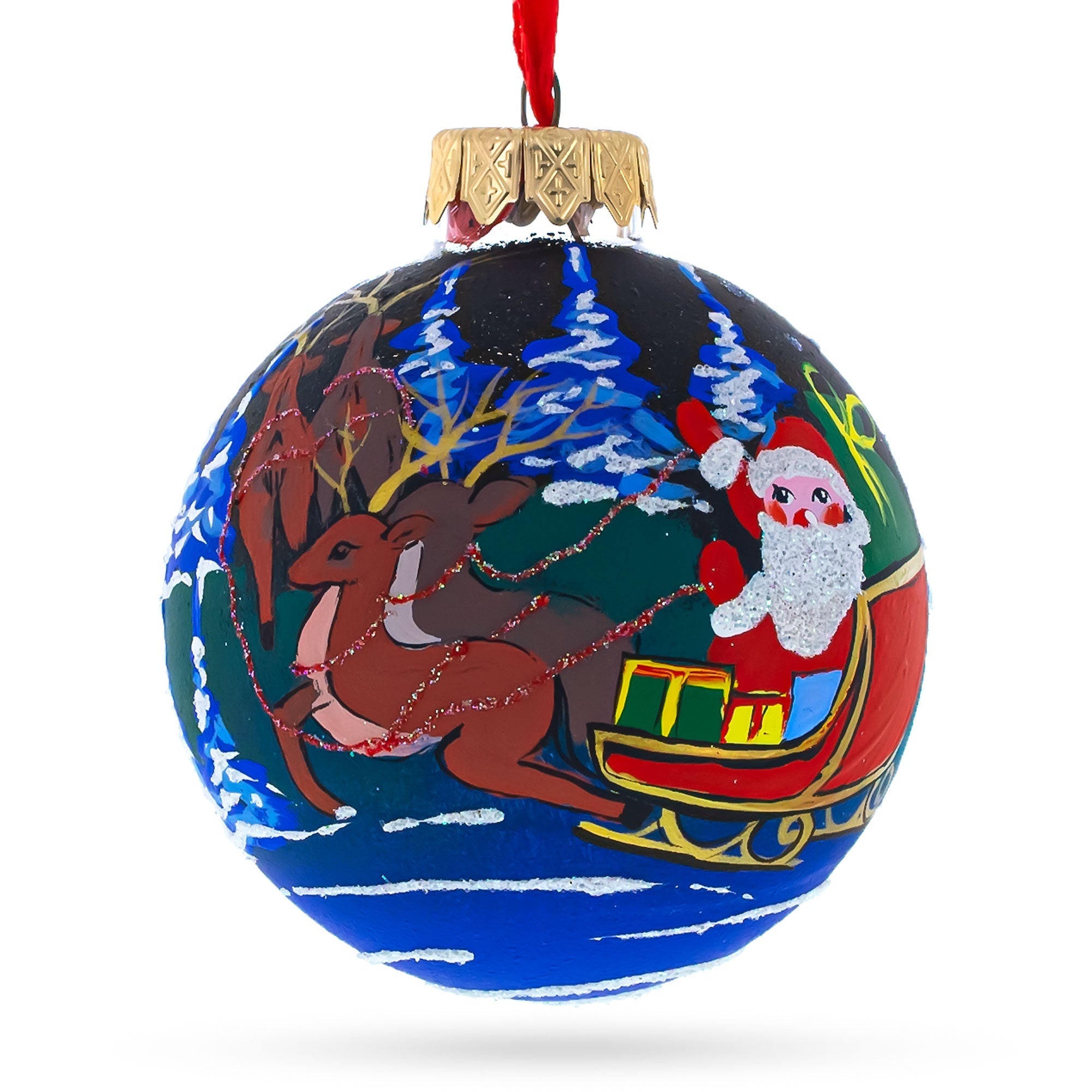 Santa's Moonlit Sleigh Ride with Reindeer Glass Ball Christmas Ornament 3.25 Inches