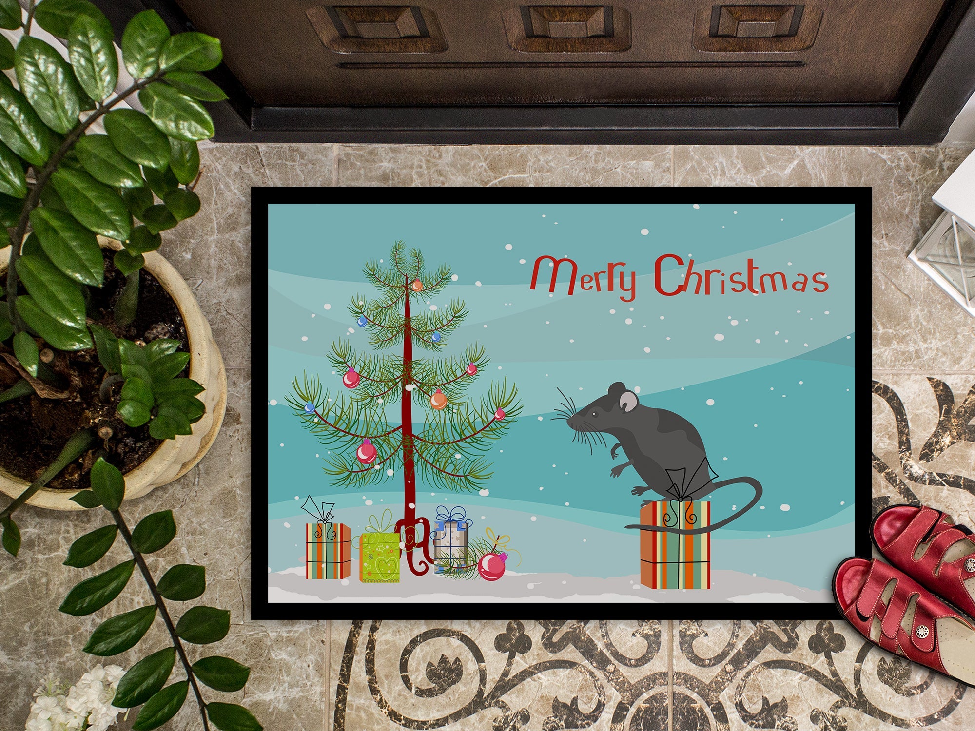 Decorate your space with our Christmas Satin Mouse artwork on a Doormat. Welcome your guests in style with our Artwork Door Mat, designed to withstand almost any weather condition. This mat, measuring approximately 18 by 27 inches, is held together by durable black binding tape. Its top layer, composed of polyester felt, is dyed with the eye-catching image you see on the mat. A few layers below provide the mat with stability, while its rubber bottom is stamped to help prevent slipping and ensures safety. Our mat works wonderfully as both an indoor or outdoor door mat. For cleaning, simply hose it off with water or use a power washer - no need for any cleaner that produces suds. Avoid scrubbing with a brush, instead, opt for the vacuum on floor setting. Designed manufactured and printed in the USA, this mat is a perfect addition to your porch, outdoor kitchen, entryway, or any indoor space. Its unique design makes it a charming decorative rug that greets your guests and adds a stylish touch to your home decor.