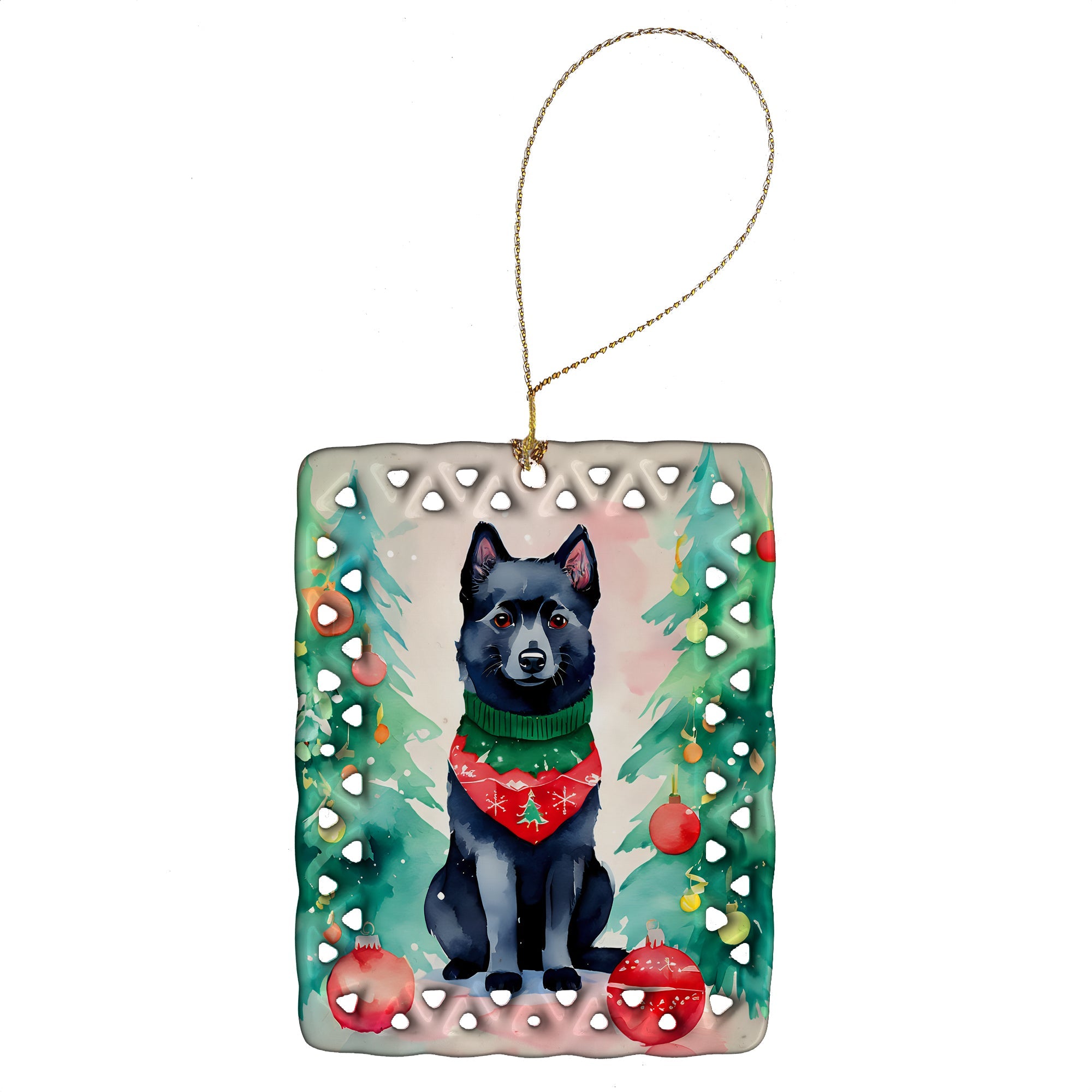 Porcelain Ornament featuring breed specific Schipperke artwork. Celebrate Christmas with this Christmas Ornament. Add a unique, personal touch to your holiday decor with our Rectangular Lattice Porcelain Ornament. Perfect for creating cherished memories, this high-quality ornament shines under festive lights, reflecting warmth and joy throughout your Christmas tree. Crafted with a glossy finish, it showcases vibrant, full-color artwork contributed by our talented artists, ensuring your tree is adorned with a burst of color and holiday spirit. What sets this Porcelain Ornament apart is its customizable white back. Use a paint pen or permanent marker to write a heartfelt message, commemorate a special year, or mark an unforgettable date, turning this ornament into a keepsake that will be treasured for years to come. For best results, allow any personalization to dry thoroughly before handling. Each ornament comes complete with a delicate gold cord, making it easy to hang and display. Proudly made in the USA, this ornament measures 3.375 x 2.625 inches and is a thoughtful gift for pet sitters, teachers, family members, or anyone who would appreciate a little extra holiday magic. Bring style, charm, and a touch of personal meaning to your Christmas tree with this beautifully designed ornament..