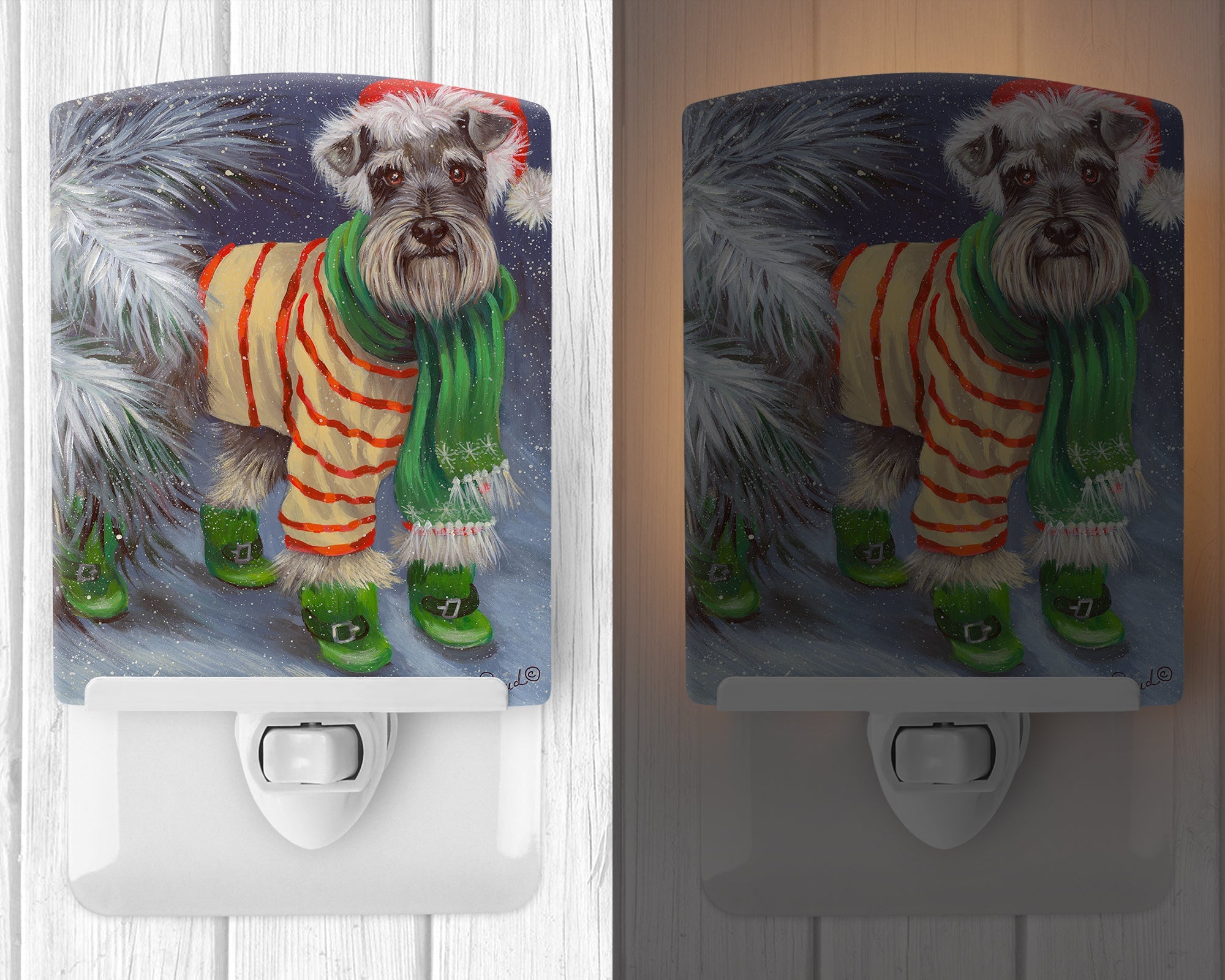 Decorate your space with our Christmas Schnauzer artwork on a Night Light. Introduce a splash of artistic flair and subtle illumination to your space with the Decorative Ceramic Night Light from Caroline's Treasures. Perfect for any room, this night light seamlessly blends functionality with an aesthetic appeal, offering a stylish solution to brighten up dark corners of your home or office. Boasting a six-inch high by four-inch wide ceramic tile at the front, it showcases vivid, full-color artwork from distinguished artists, transforming a simple utility into a vibrant art piece. The artwork is securely encased in a robust metal holder, ensuring durability and longevity. Two screws are provided to firmly affix the tile into the holder. The holder extends three inches deep, housing an included bulb that emits a soft, welcoming glow. This product meets all safety standards, as evidenced by its UL approval. Proudly made in the United States from imported components, this Decorative Ceramic Night Light is not just a functional device; it's a statement piece that enhances the ambiance of your surroundings.