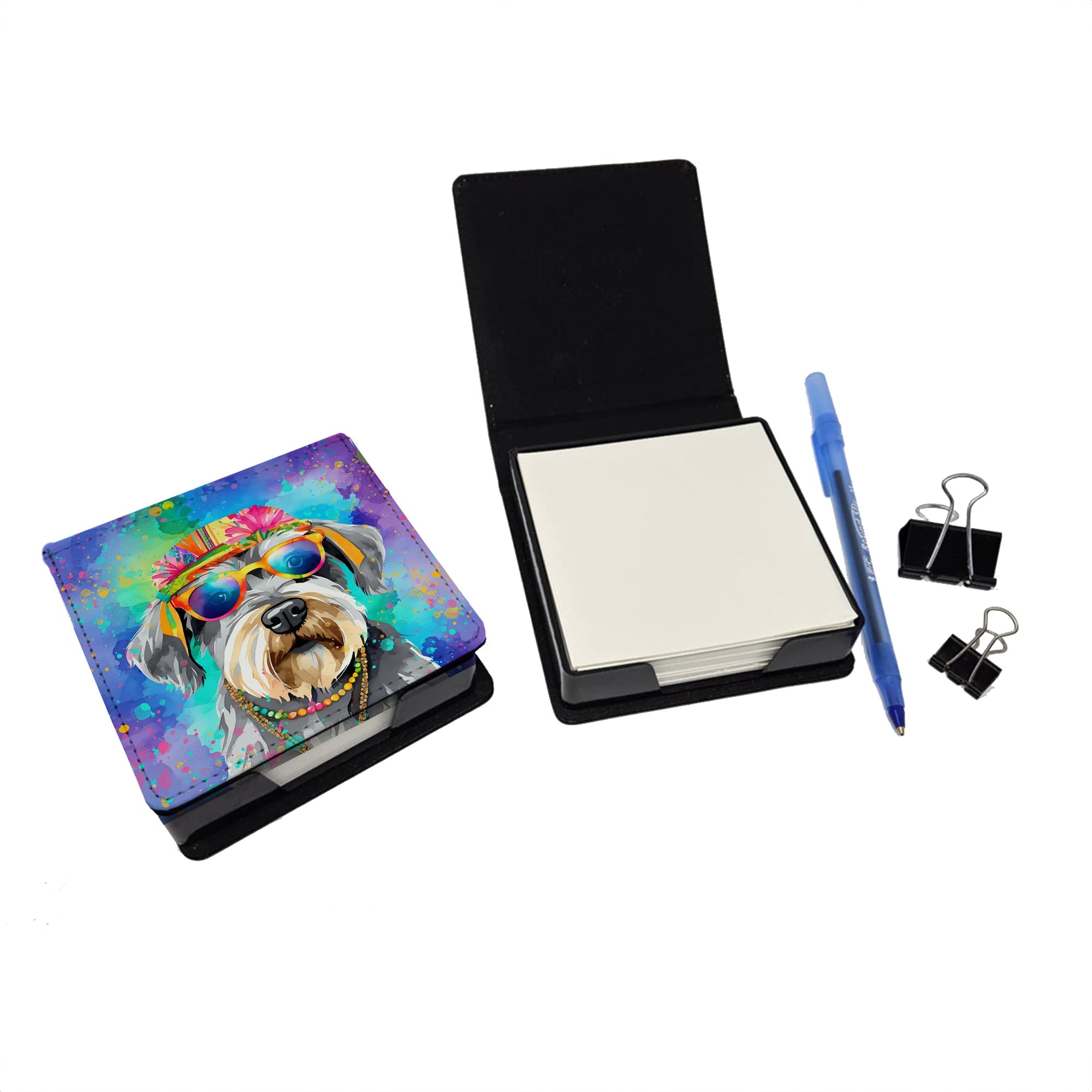 PU Leather Note Paper Holder featuring breed specific Schnauzer artwork. Elevate your workspace with this PU Leather Note Paper Holder, crafted to resemble luxurious leather without the use of animal products. Made from durable synthetic PU leather, it offers both a premium look and eco-friendly appeal. This note holder, compactly sized at 4.25 x 4.25 x 1.25 inches, includes about 160 sheets of 3.75 x 3.75-inch note paper—ideal for quick notes and reminders. An exclusive artist-designed cover makes each holder uniquely vibrant, adding a splash of color and personality to any desk or office. The discrete design keeps note paper hidden, maintaining a neat and organized workspace. Perfect as a gift or for personal use, this stylish holder is refillable with standard paper, ensuring long-lasting utility. A must-have for anyone seeking a sophisticated, artful touch to their workspace while supporting animal-friendly products. Add style, organization, and creativity to your everyday routine with this elegant note paper holder.