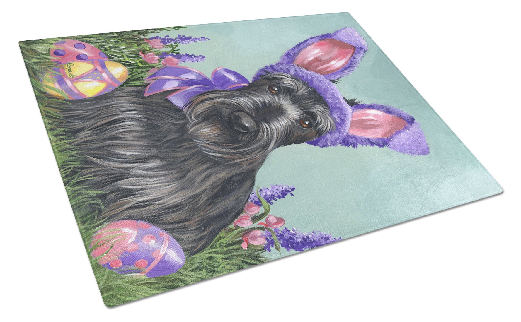 Decorate your space with our Easter Scottish Terrier artwork on a Cutting Board. Introduce your kitchen to the vibrant, large Decorative Glass Cutting Board from Caroline's Treasures. Crafted from resilient tempered glass, this board is not only a utilitarian necessity but also a colorful art piece. With its generous dimensions of 15 inches in height and 12 inches in length, it offers ample space for all your cutting needs. Every piece showcases captivating artwork from distinguished artists, bringing an aesthetic edge to your kitchen. Beyond its attractive design, this cutting board ensures your countertop stays pristine and unscathed, owing to its heat-resistant properties. Engineered with user convenience in mind, it features non-skid feet for stability, and rounded corners for additional safety. Its robust construction renders it virtually unbreakable, guaranteeing longevity. The board comes with protective feet bumpers, maintaining its position during use. This product is recommended to be hand washed only. Proudly printed and assembled in the United States, this cutting board exemplifies superior craftsmanship. With Caroline's Treasures' Decorative Glass Cutting Board, you're investing in a blend of functionality and artistic flair.
