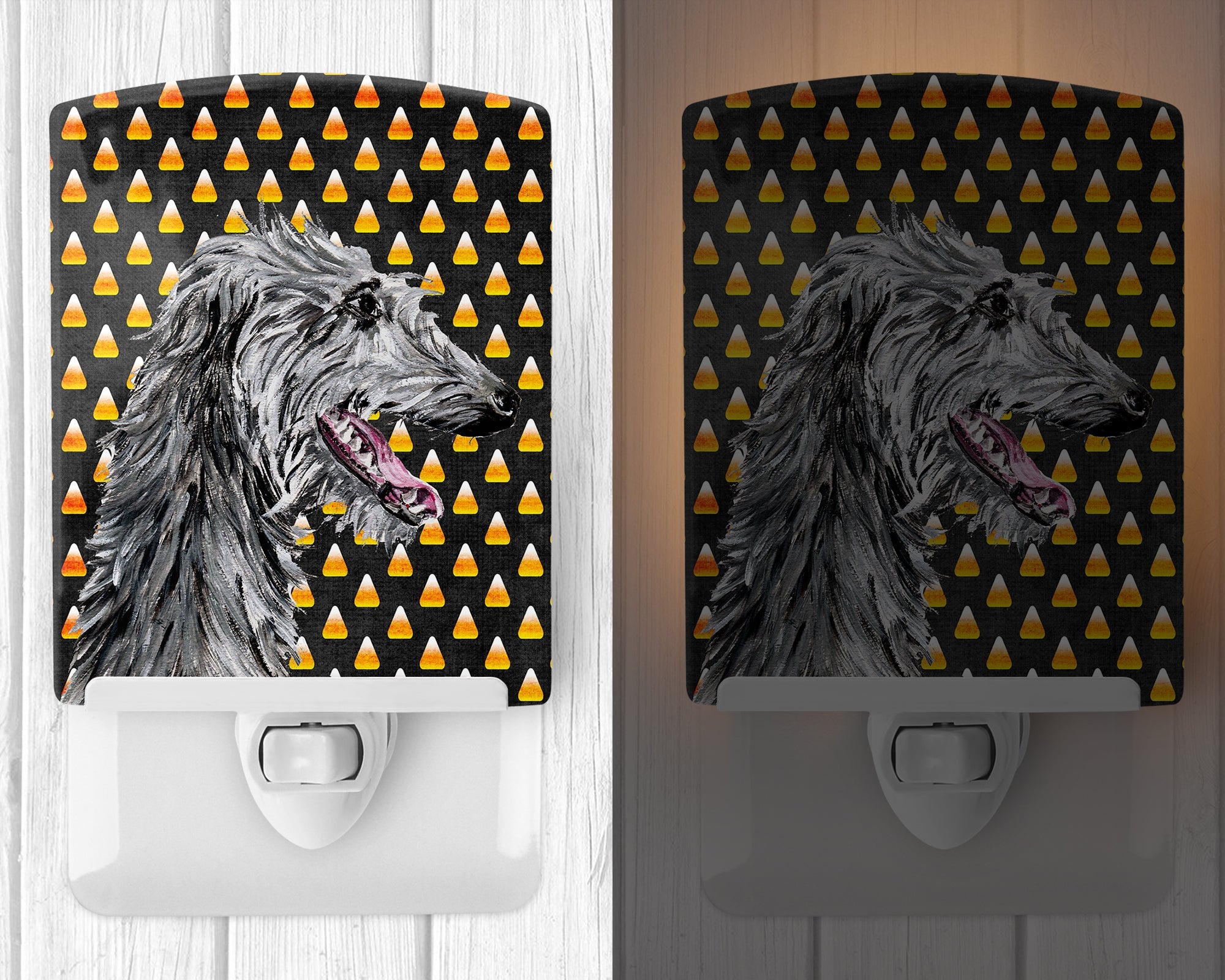 Decorate your space with our Halloween Scottish Deerhound artwork on a Night Light. Introduce a splash of artistic flair and subtle illumination to your space with the Decorative Ceramic Night Light from Caroline's Treasures. Perfect for any room, this night light seamlessly blends functionality with an aesthetic appeal, offering a stylish solution to brighten up dark corners of your home or office. Boasting a six-inch high by four-inch wide ceramic tile at the front, it showcases vivid, full-color artwork from distinguished artists, transforming a simple utility into a vibrant art piece. The artwork is securely encased in a robust metal holder, ensuring durability and longevity. Two screws are provided to firmly affix the tile into the holder. The holder extends three inches deep, housing an included bulb that emits a soft, welcoming glow. This product meets all safety standards, as evidenced by its UL approval. Proudly made in the United States from imported components, this Decorative Ceramic Night Light is not just a functional device; it's a statement piece that enhances the ambiance of your surroundings.