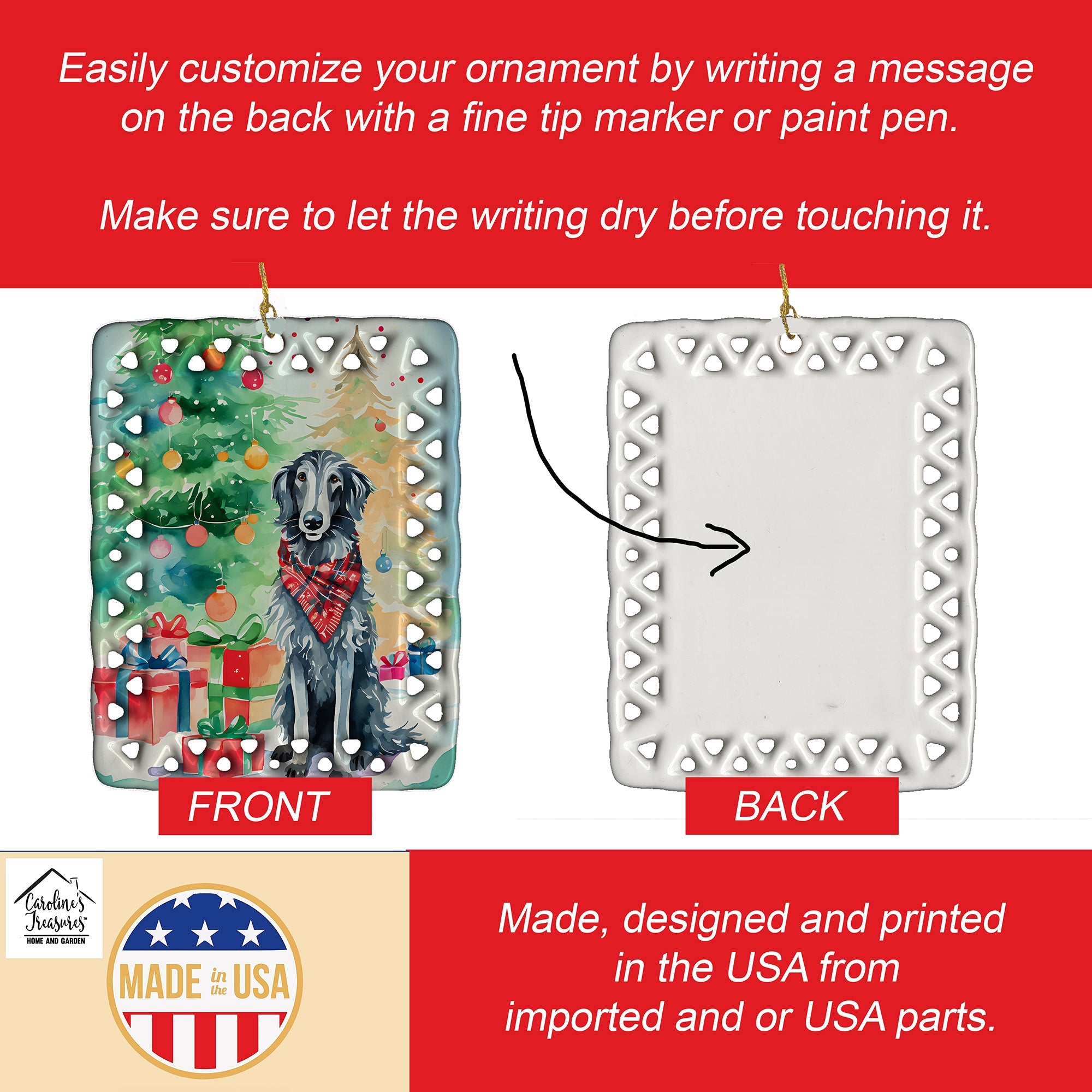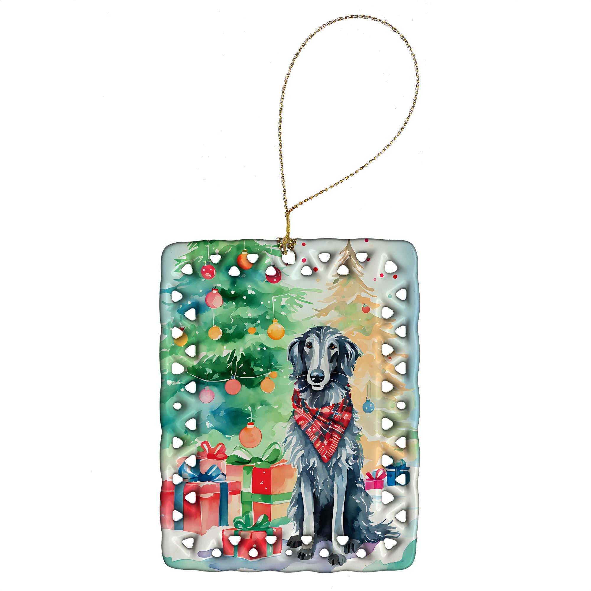 Porcelain Ornament featuring breed specific Scottish Deerhound artwork. Celebrate Christmas with this Christmas Ornament. Add a unique, personal touch to your holiday decor with our Rectangular Lattice Porcelain Ornament. Perfect for creating cherished memories, this high-quality ornament shines under festive lights, reflecting warmth and joy throughout your Christmas tree. Crafted with a glossy finish, it showcases vibrant, full-color artwork contributed by our talented artists, ensuring your tree is adorned with a burst of color and holiday spirit. What sets this Porcelain Ornament apart is its customizable white back. Use a paint pen or permanent marker to write a heartfelt message, commemorate a special year, or mark an unforgettable date, turning this ornament into a keepsake that will be treasured for years to come. For best results, allow any personalization to dry thoroughly before handling. Each ornament comes complete with a delicate gold cord, making it easy to hang and display. Proudly made in the USA, this ornament measures 3.375 x 2.625 inches and is a thoughtful gift for pet sitters, teachers, family members, or anyone who would appreciate a little extra holiday magic. Bring style, charm, and a touch of personal meaning to your Christmas tree with this beautifully designed ornament..