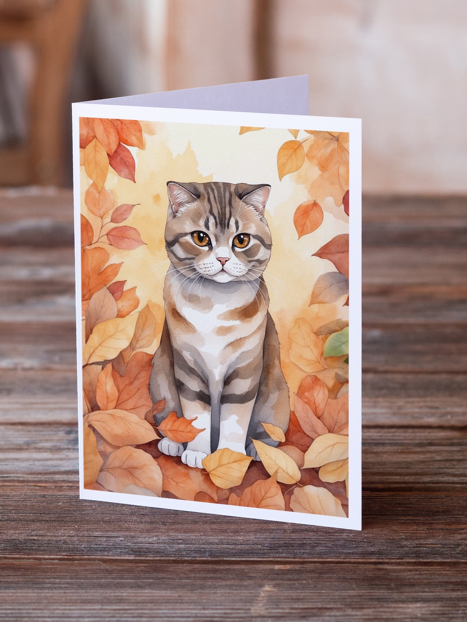 Greeting Cards Pack of 8 featuring breed specific Scottish Fold artwork. Celebrate special moments with Caroline's Treasures Printed Greeting Card Pack. This pack includes eight beautifully folded 5x7 cards, accompanied by eight matching white envelopes. With blank interiors, these cards provide ample space for your personalized messages and heartfelt holiday greetings. Each card features captivating full-color artwork, meticulously printed in our facility on high-quality 80 lb cover stock or 216 GSM. The super smooth finish of the white cards enhances the visual impact of the artwork, creating a truly stunning presentation. Designed by our talented in-house artists or licensed artists, the artwork on these cards showcases their creativity and attention to detail. From vibrant illustrations to captivating designs, each card tells its own unique story. Whether it's for birthdays, anniversaries, holidays, or any special occasion, Caroline's Treasures Greeting Card Pack is the perfect way to convey your heartfelt sentiments. Share joy, love, and warm wishes with these exquisite cards and make every moment unforgettable.