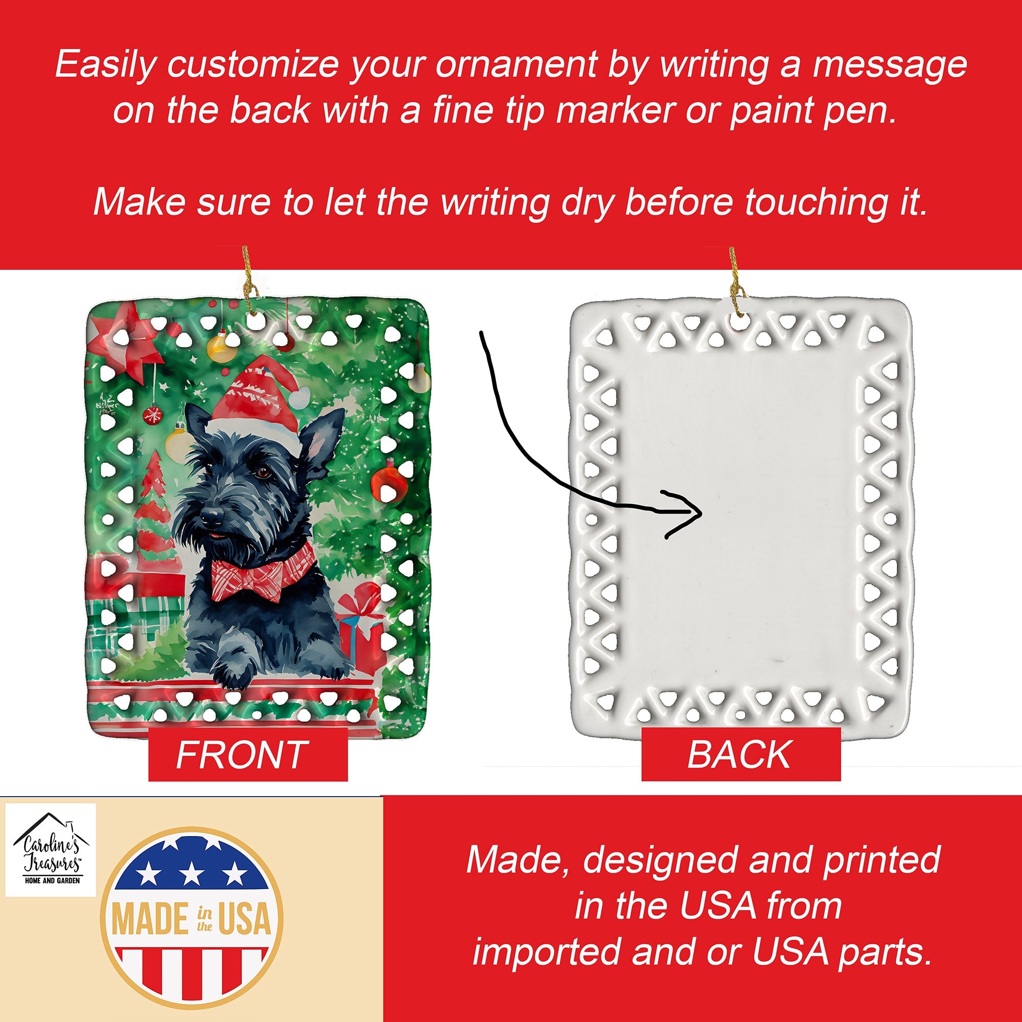 Porcelain Ornament featuring breed specific Scottish Terrier Scottie artwork. Celebrate Christmas with this Christmas Ornament. Add a unique, personal touch to your holiday decor with our Rectangular Lattice Porcelain Ornament. Perfect for creating cherished memories, this high-quality ornament shines under festive lights, reflecting warmth and joy throughout your Christmas tree. Crafted with a glossy finish, it showcases vibrant, full-color artwork contributed by our talented artists, ensuring your tree is adorned with a burst of color and holiday spirit. What sets this Porcelain Ornament apart is its customizable white back. Use a paint pen or permanent marker to write a heartfelt message, commemorate a special year, or mark an unforgettable date, turning this ornament into a keepsake that will be treasured for years to come. For best results, allow any personalization to dry thoroughly before handling. Each ornament comes complete with a delicate gold cord, making it easy to hang and display. Proudly made in the USA, this ornament measures 3.375 x 2.625 inches and is a thoughtful gift for pet sitters, teachers, family members, or anyone who would appreciate a little extra holiday magic. Bring style, charm, and a touch of personal meaning to your Christmas tree with this beautifully designed ornament..