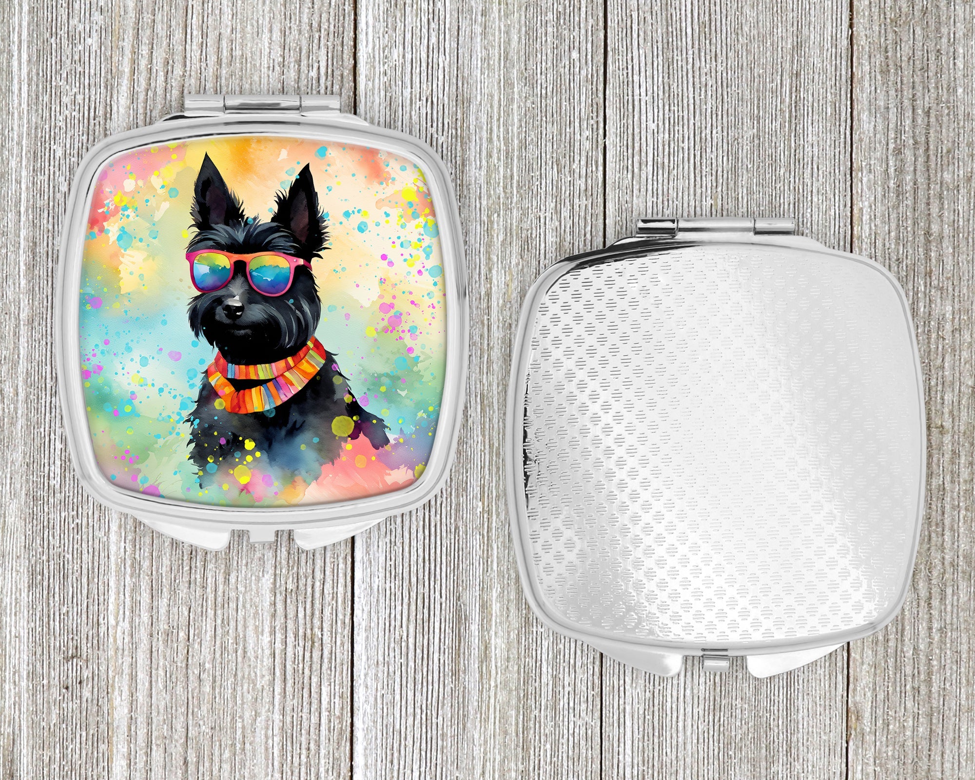 Decorate your space with our Scottish Terrier artwork on a Compact Mirror. Bring a bit of Summer into your home with a Summer Compact Mirror. Introducing our Square Compact Mirror, a blend of elegance, functionality, and compactness, perfect for on-the-go touch-ups. This Silvertone metal mirror, with dimensions of 2.75 inches x 3 inches x .3 inches, fits effortlessly into your purse, handbag, or pocket, ensuring that you can check your appearance anytime, anywhere. Our compact mirror stands out with its eye-catching artwork on the front, adding a dash of style to this practical accessory. It is more than just a mirror; it's a statement piece that reflects your personality and aesthetic. When opened, this compact reveals two mirrors inside, doubling your perspective for precise touch-ups. The Silvertone metal construction ensures durability while maintaining a lightweight feel, making it an ideal everyday carry item. Whether you're rushing to a meeting, prepping for a dinner date, or just need a quick check on your look, our Square Compact Mirror is your reliable companion. Experience the perfect blend of style and practicality with this must-have accessory.