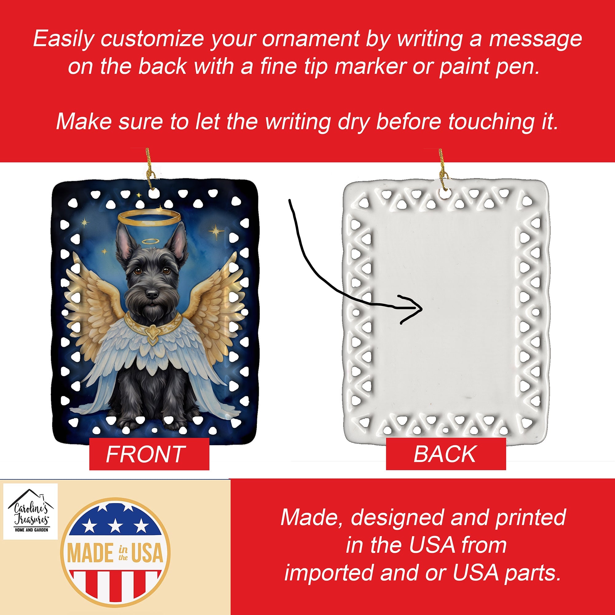 Porcelain Ornament featuring breed specific Scottish Terrier artwork. Celebrate Christmas with this Christmas Ornament. Add a unique, personal touch to your holiday decor with our Rectangular Lattice Porcelain Ornament. Perfect for creating cherished memories, this high-quality ornament shines under festive lights, reflecting warmth and joy throughout your Christmas tree. Crafted with a glossy finish, it showcases vibrant, full-color artwork contributed by our talented artists, ensuring your tree is adorned with a burst of color and holiday spirit. What sets this Porcelain Ornament apart is its customizable white back. Use a paint pen or permanent marker to write a heartfelt message, commemorate a special year, or mark an unforgettable date, turning this ornament into a keepsake that will be treasured for years to come. For best results, allow any personalization to dry thoroughly before handling. Each ornament comes complete with a delicate gold cord, making it easy to hang and display. Proudly made in the USA, this ornament measures 3.375 x 2.625 inches and is a thoughtful gift for pet sitters, teachers, family members, or anyone who would appreciate a little extra holiday magic. Bring style, charm, and a touch of personal meaning to your Christmas tree with this beautifully designed ornament..