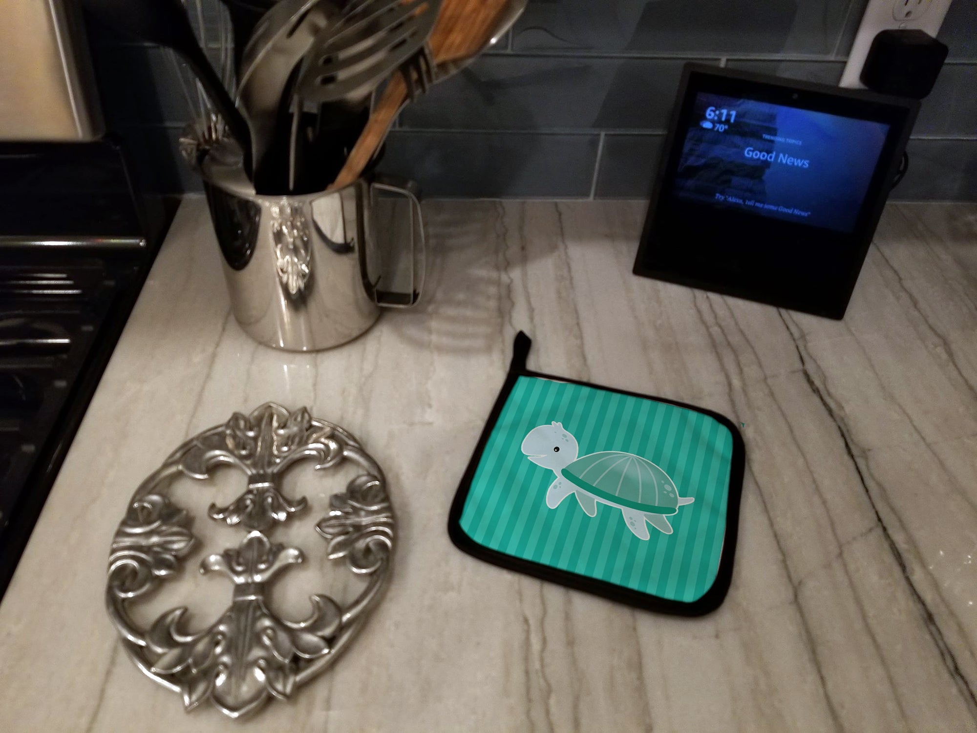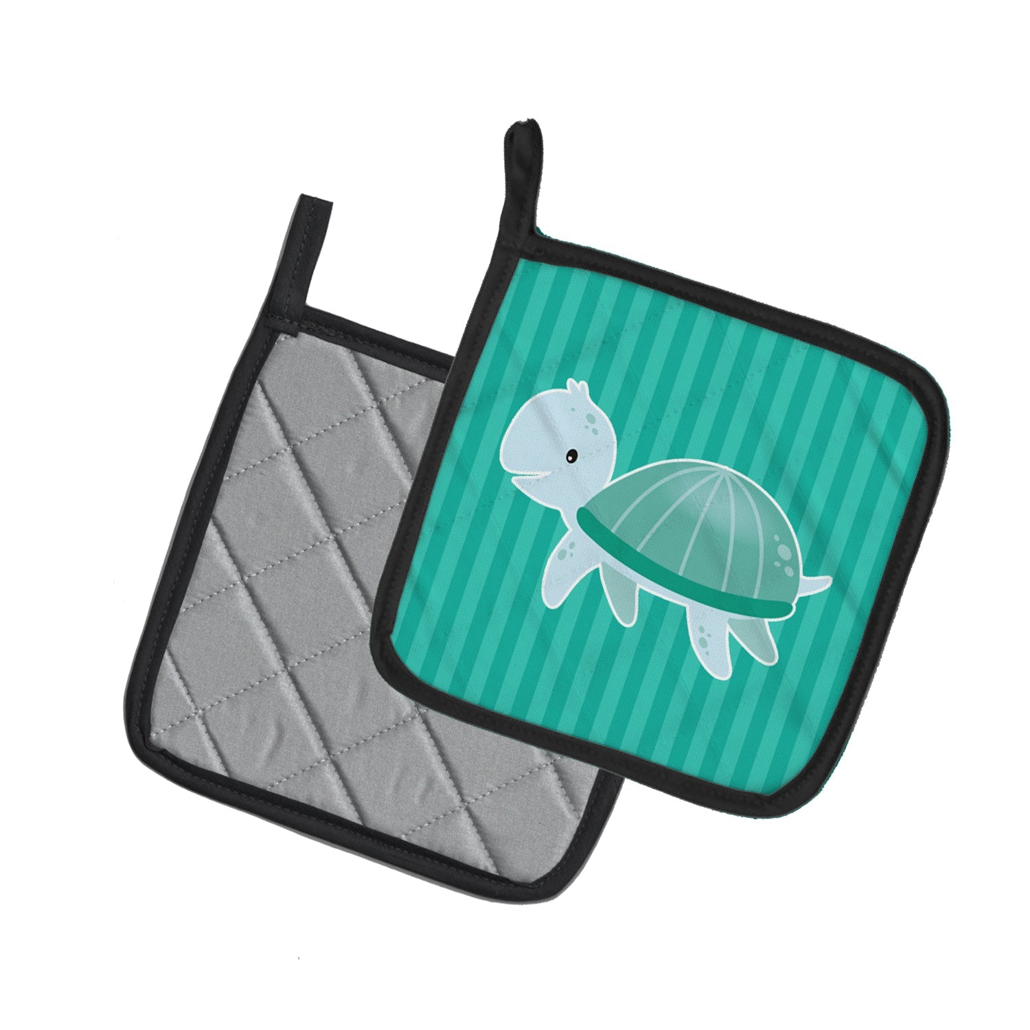 Decorate your space with our Turtle artwork on a Pair of Pot Holders. A Pair of Pot Holders to match your kitchen decor. Made in the USA these are thick and functional. Full color artwork decorates the front polyester fabric of the hot pad and accented by a black trim. Use these at as a trivet for your Thanksgiving or Christmas tablescape. Filled with insulated fabric and quilted for durability. These colorful pot holders will make a great gift for your favorite home cook or executive chef. Each pot holder measures approximately 7 1/2 inches by 7 1/2 inches. A hanging tab is included.
