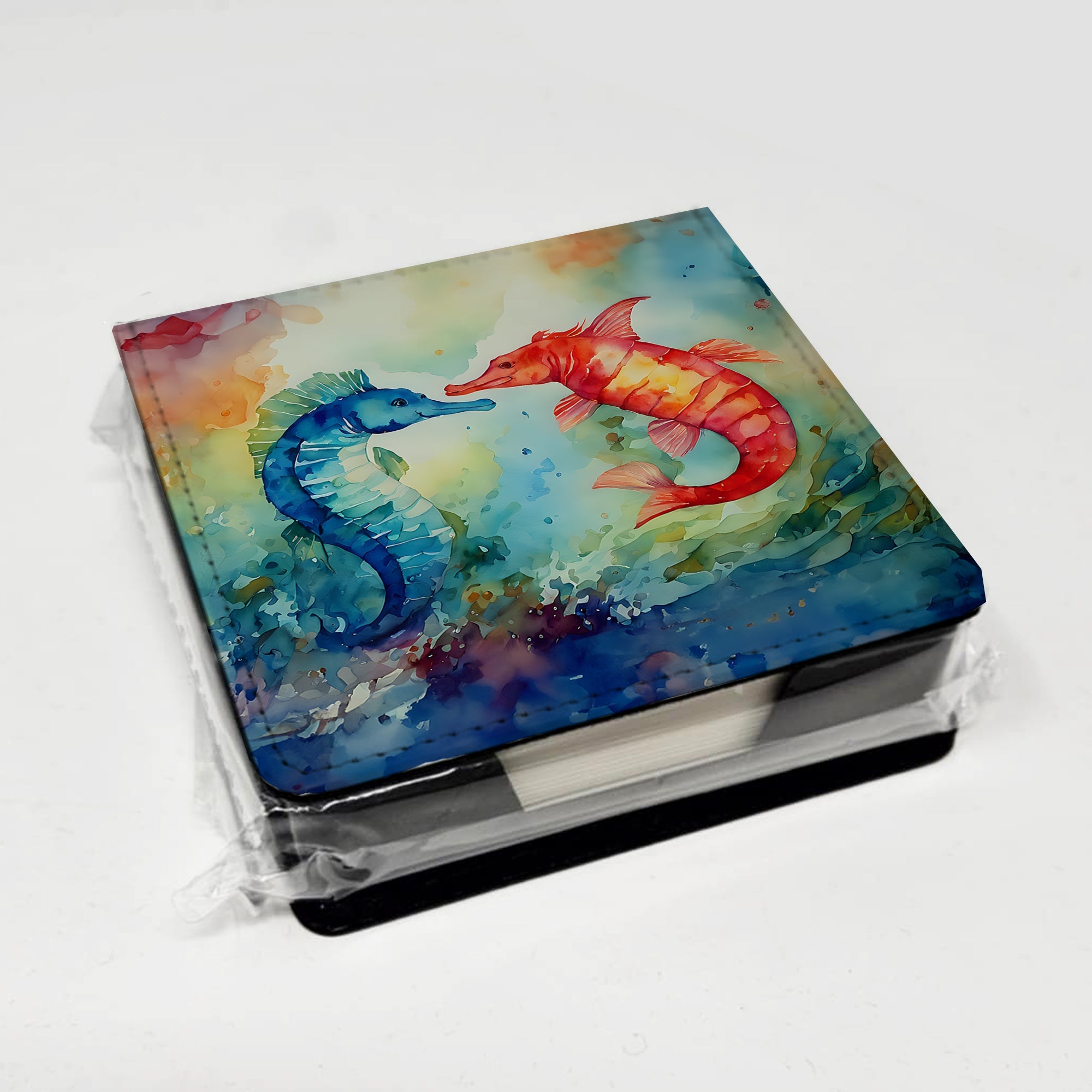 PU Leather Note Paper Holder featuring breed specific Seahorses artwork. Elevate your workspace with this PU Leather Note Paper Holder, crafted to resemble luxurious leather without the use of animal products. Made from durable synthetic PU leather, it offers both a premium look and eco-friendly appeal. This note holder, compactly sized at 4.25 x 4.25 x 1.25 inches, includes about 160 sheets of 3.75 x 3.75-inch note paper—ideal for quick notes and reminders. An exclusive artist-designed cover makes each holder uniquely vibrant, adding a splash of color and personality to any desk or office. The discrete design keeps note paper hidden, maintaining a neat and organized workspace. Perfect as a gift or for personal use, this stylish holder is refillable with standard paper, ensuring long-lasting utility. A must-have for anyone seeking a sophisticated, artful touch to their workspace while supporting animal-friendly products. Add style, organization, and creativity to your everyday routine with this elegant note paper holder.
