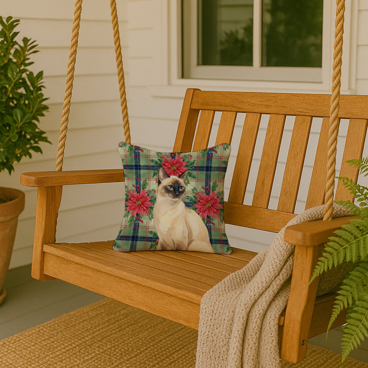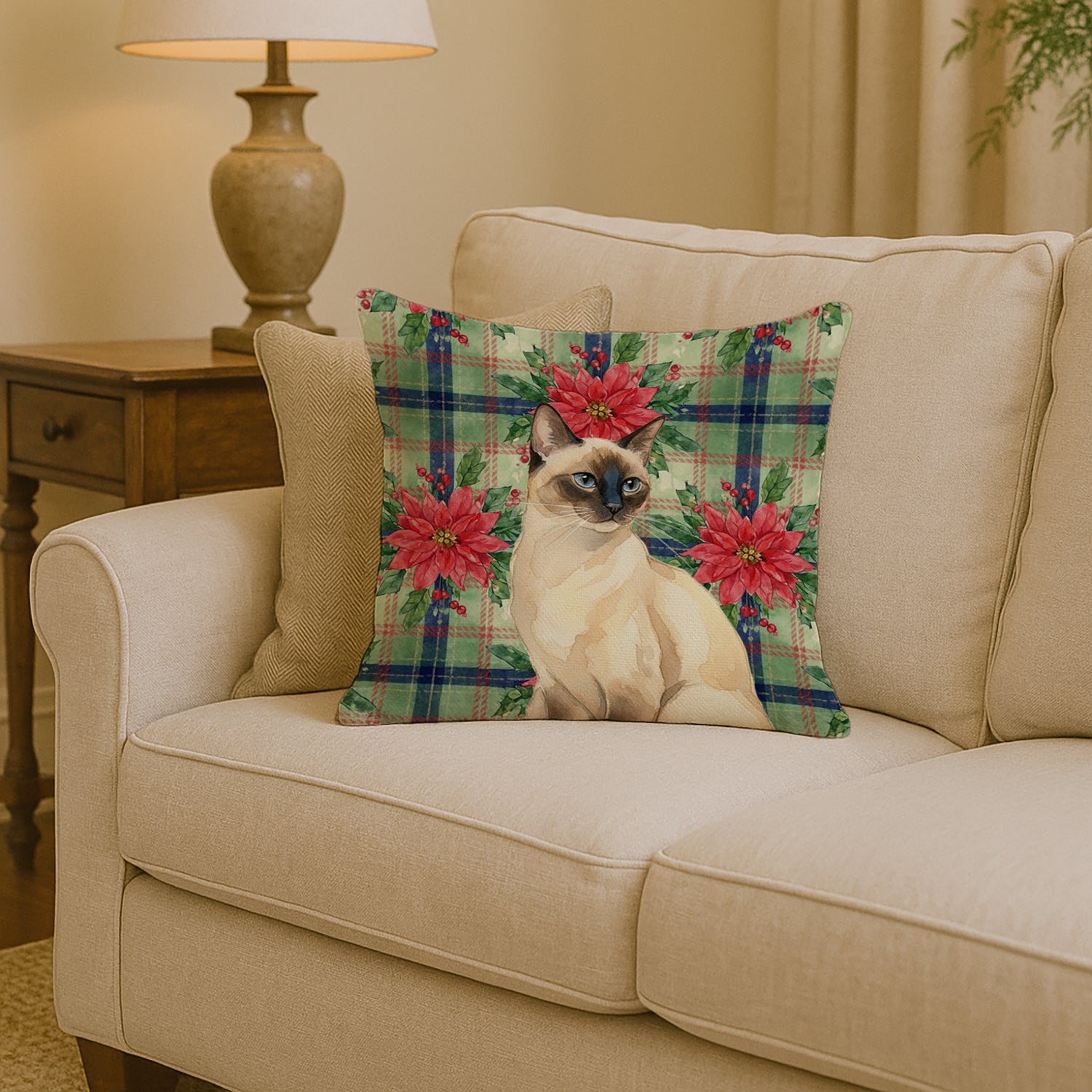 Throw Pillow featuring breed specific Seal Point artwork. Celebrate Christmas with this Christmas Pillow. Add a touch of vibrancy and comfort to your outdoor seating with Caroline's Treasures Fabric Decorative Pillow. Measuring approximately 14 inches by 14 inches, this outdoor pillow is crafted to elevate the appeal of your patio furniture, infusing it with vivid color and artistic flair. The pillow includes a 100% Polyester Fabric sham filled with a quality pillow form to provide superior comfort. Innovatively made from our brand new material, specifically woven for its water resistance, this pillow is designed for durability. The soft canvas fabric offers versatility in use, fit for your indoor couch or your outdoor patio, porch, or veranda. The fabric is dyed with colorfast dyes built for resilience against weather conditions, ensuring the pillow retains its beauty over time. Constructed by sewing three fabric pieces to create a sham, the polyester insert is then nestled inside to form the pillow, resulting in an overstuffed pillow that maintains its shape. Both the sham and the pillow insert are proudly made in the United States. As the pillows are handcrafted, there may be minor variations in size, further enhancing their unique charm. Experience comfort in style with Caroline's Treasures Fabric Decorative Pillow.
