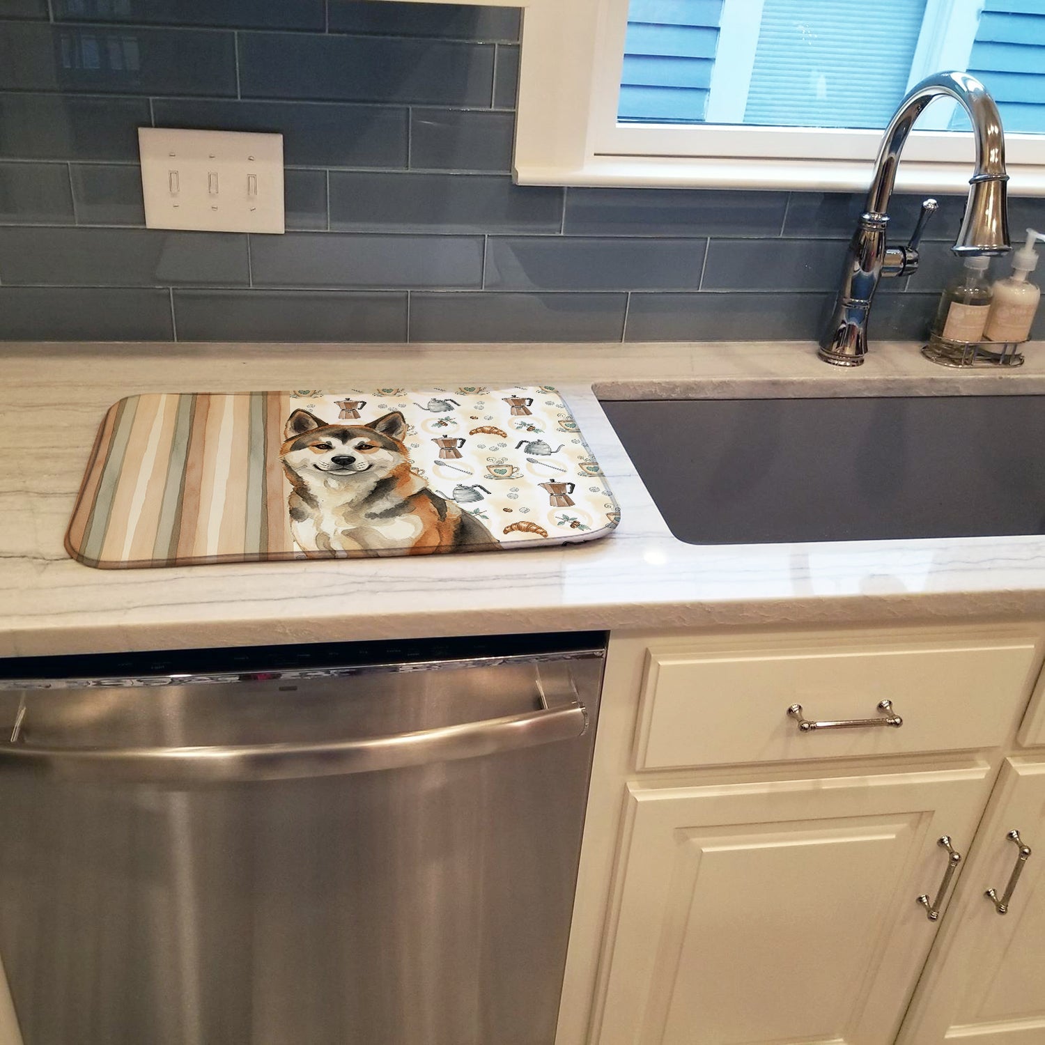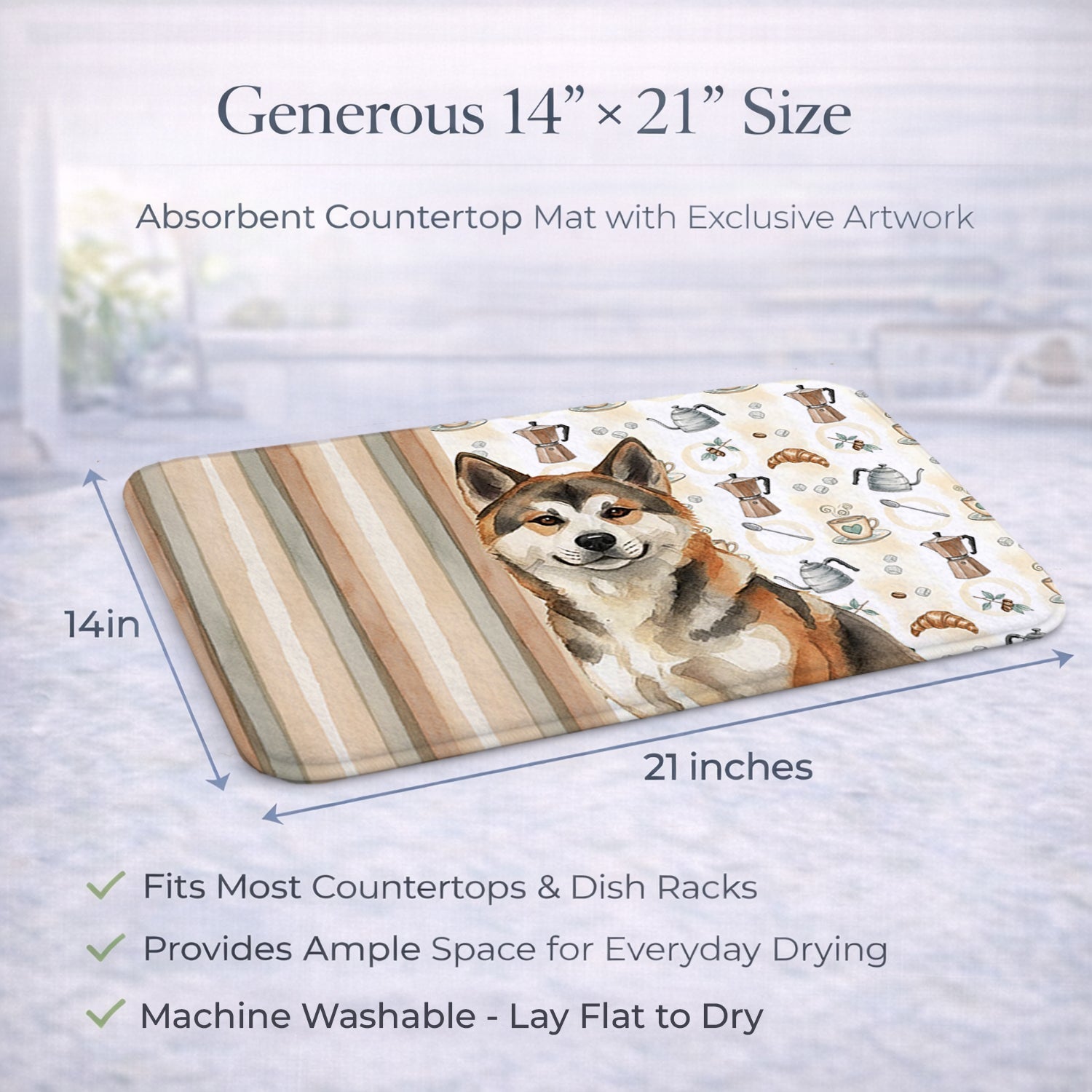Shown here is the Sesame Akita Coffee Bar Dish Drying Mat from Caroline's Treasures featuring artwork of a Akita in a Everyday design. The detailed illustration and vibrant colors make it a standout accent that celebrates both seasonal style and love for the subject. This image features a cozy watercolor coffee-themed pattern with illustrated mugs, moka pots, kettles, croissants, coffee beans, and sugar cubes arranged in a repeating design. Soft neutral tones with warm browns, creams, and subtle sage accents create an inviting, café-inspired look that feels comforting and relaxed. Everyday décor celebrates personal style and the small moments that make a house feel like home. Thoughtful designs add warmth and personality that can be enjoyed year-round. Say goodbye to messy countertops and soggy dish towels with our innovative dish drying mat. Our high-quality dish drying pad is designed to keep your countertops dry while offering a stylish and efficient solution. Whether you're air drying dishes, glasses, stemware, silverware, pots, pans, bottles, or even fruits and vegetables, our dish mat is the perfect choice. The 14 inches x 21 inches size fits most counters and dish drying racks, and the non-slip design ensures stability. Made with water-absorbent polyester and a polyurethane foam insert, our dish drying mat is not only functional but also durable. It's machine washable and printed in the USA for long-lasting use. The beautiful artwork adds flair to your kitchen decor, making it a perfect housewarming gift or present for any occasion. Upgrade your kitchen experience with our absorbent and versatile dish drying mat. Perfect for: Kitchen counters and sinks, everyday dish drying and countertop protection, Dogs-themed homes, or year-round use for Akita lovers. Akitas are powerful and dignified dogs known for their loyalty, strength, and calm confidence. Originating in Japan, this noble breed is deeply devoted to its family and respected for its protective instincts and quiet presence. Makes a heartfelt gift for: Akita owners, Dogs lovers, Everyday gifts, pet parents, friends who adore their Akita, or anyone celebrating Dogs.