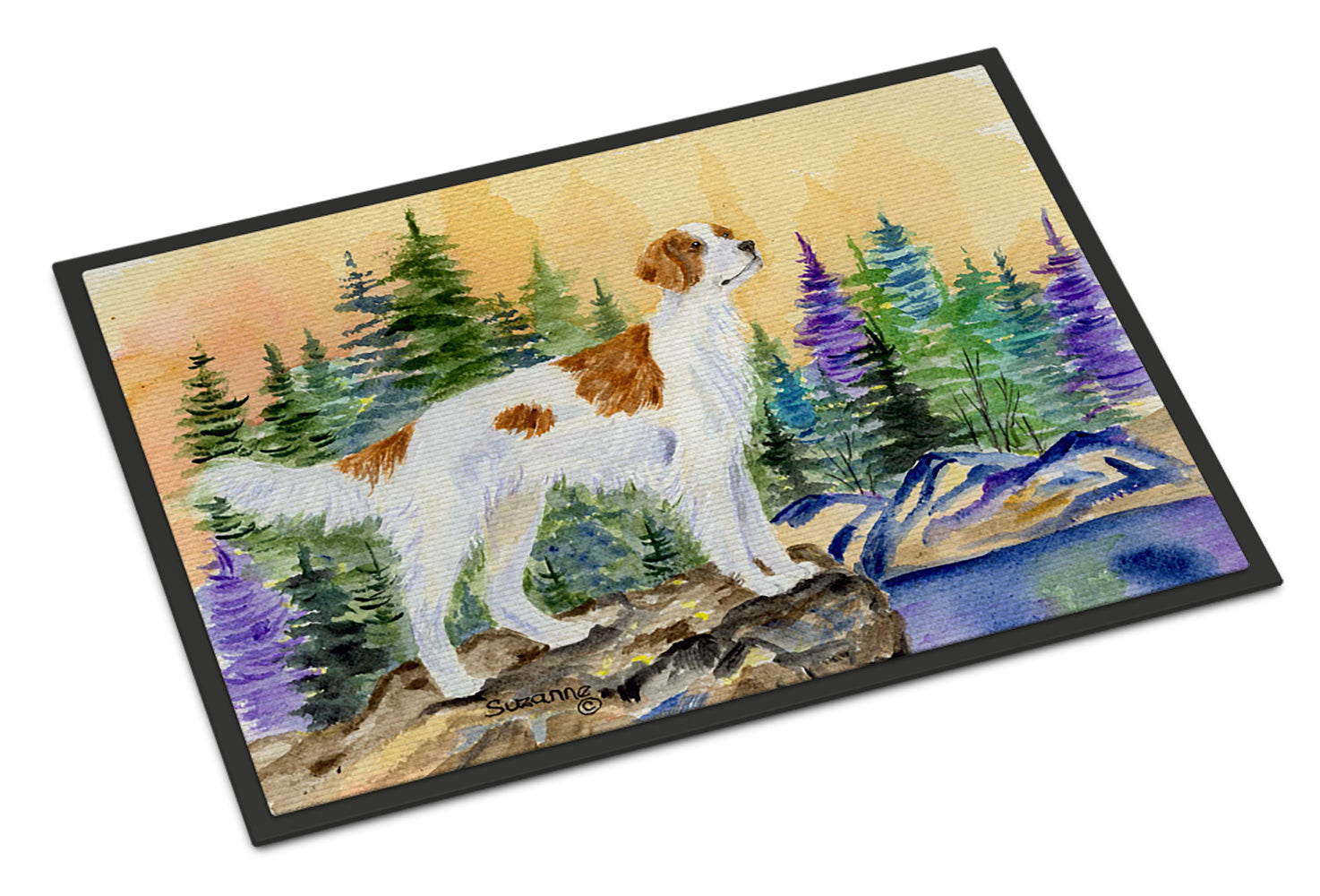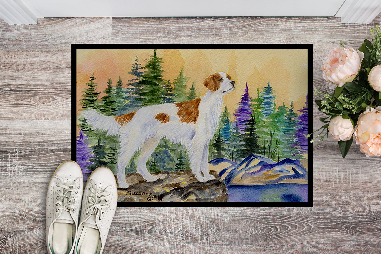 Decorate your space with our Setter artwork on a Doormat. Welcome your guests in style with our Artwork Door Mat, designed to withstand almost any weather condition. This mat, measuring approximately 24 by 36 inches, is held together by durable black binding tape. Its top layer, composed of polyester felt, is dyed with the eye-catching image you see on the mat. A few layers below provide the mat with stability, while its rubber bottom is stamped to help prevent slipping and ensures safety. Our mat works wonderfully as both an indoor or outdoor door mat. For cleaning, simply hose it off with water or use a power washer - no need for any cleaner that produces suds. Avoid scrubbing with a brush, instead, opt for the vacuum on floor setting. Designed manufactured and printed in the USA, this mat is a perfect addition to your porch, outdoor kitchen, entryway, or any indoor space. Its unique design makes it a charming decorative rug that greets your guests and adds a stylish touch to your home decor.