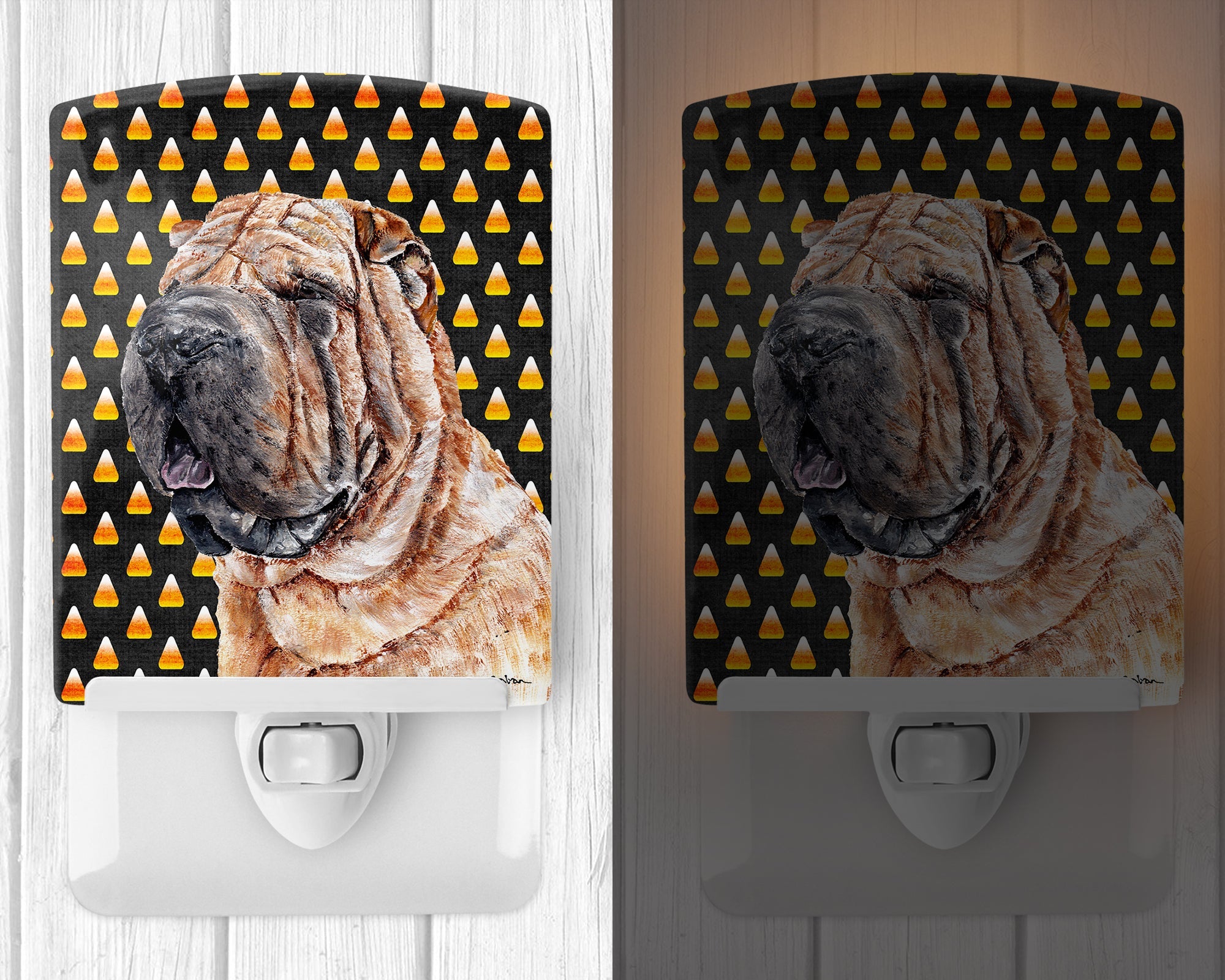 Decorate your space with our Halloween Shar Pei artwork on a Night Light. Introduce a splash of artistic flair and subtle illumination to your space with the Decorative Ceramic Night Light from Caroline's Treasures. Perfect for any room, this night light seamlessly blends functionality with an aesthetic appeal, offering a stylish solution to brighten up dark corners of your home or office. Boasting a six-inch high by four-inch wide ceramic tile at the front, it showcases vivid, full-color artwork from distinguished artists, transforming a simple utility into a vibrant art piece. The artwork is securely encased in a robust metal holder, ensuring durability and longevity. Two screws are provided to firmly affix the tile into the holder. The holder extends three inches deep, housing an included bulb that emits a soft, welcoming glow. This product meets all safety standards, as evidenced by its UL approval. Proudly made in the United States from imported components, this Decorative Ceramic Night Light is not just a functional device; it's a statement piece that enhances the ambiance of your surroundings.