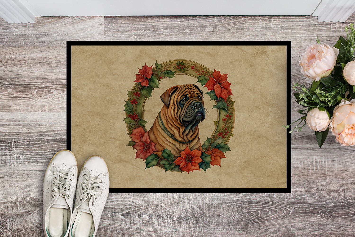 Decorate your space with our Christmas Shar Pei artwork on a Doormat. Bring a bit of Winter into your home with a Winter Doormat. Welcome your guests in style with our Artwork Door Mat, designed to withstand almost any weather condition. This mat, measuring approximately 24 by 36 inches, is held together by durable black binding tape. Its top layer, composed of polyester felt, is dyed with the eye-catching image you see on the mat. A few layers below provide the mat with stability, while its rubber bottom is stamped to help prevent slipping and ensures safety. Our mat works wonderfully as both an indoor or outdoor door mat. For cleaning, simply hose it off with water or use a power washer - no need for any cleaner that produces suds. Avoid scrubbing with a brush, instead, opt for the vacuum on floor setting. Designed manufactured and printed in the USA, this mat is a perfect addition to your porch, outdoor kitchen, entryway, or any indoor space. Its unique design makes it a charming decorative rug that greets your guests and adds a stylish touch to your home decor.