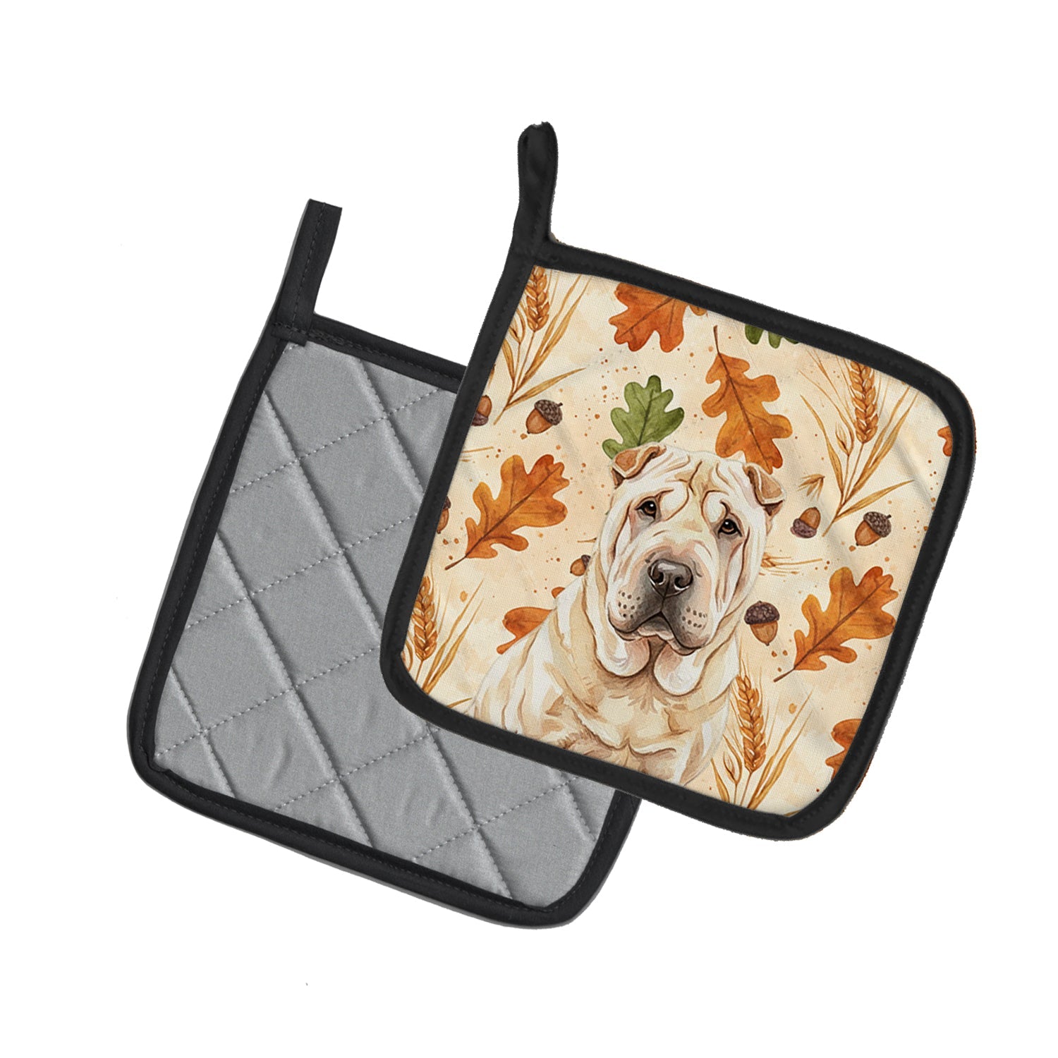 Pair of Pot Holders featuring breed specific Shar Pei artwork. Celebrate Thanksgiving with this Thanksgiving Pair of Pot Holders. Add warmth, personality, and function to your kitchen with our Heirloom Fall Pot Holder Pair. Each set includes two quilted hot pads, featuring original full-color watercolor artwork on a soft polyester front accented by black trim. Crafted with multiple layers for performance: Top Layer: Vibrant artwork permanently dyed into polyester fabric. Middle Layer: US-manufactured insulated material with breathable polyester fibers and a reflective metalized film that reflects heat back to its source. Bottom Layer: A silver heat-resistant backing for extra protection. Each pot holder measures 7.5" x 7.5", includes a hanging tab, and is quilted for durability. Use them to protect your hands, countertops, and tabletops — or as decorative trivets for Thanksgiving, Christmas, or everyday meals.