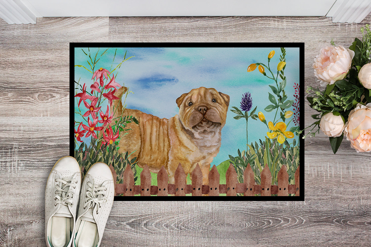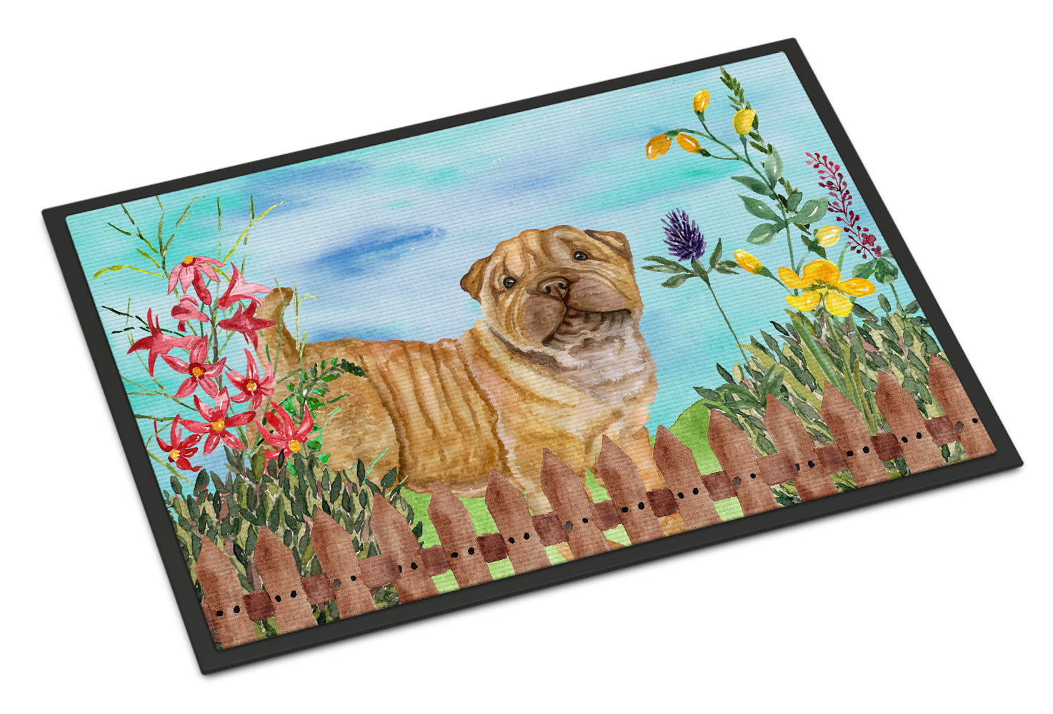 Decorate your space with our Shar Pei artwork on a Doormat. Bring a bit of Spring into your home with a Spring Doormat. Welcome your guests in style with our Artwork Door Mat, designed to withstand almost any weather condition. This mat, measuring approximately 18 by 27 inches, is held together by durable black binding tape. Its top layer, composed of polyester felt, is dyed with the eye-catching image you see on the mat. A few layers below provide the mat with stability, while its rubber bottom is stamped to help prevent slipping and ensures safety. Our mat works wonderfully as both an indoor or outdoor door mat. For cleaning, simply hose it off with water or use a power washer - no need for any cleaner that produces suds. Avoid scrubbing with a brush, instead, opt for the vacuum on floor setting. Designed manufactured and printed in the USA, this mat is a perfect addition to your porch, outdoor kitchen, entryway, or any indoor space. Its unique design makes it a charming decorative rug that greets your guests and adds a stylish touch to your home decor.