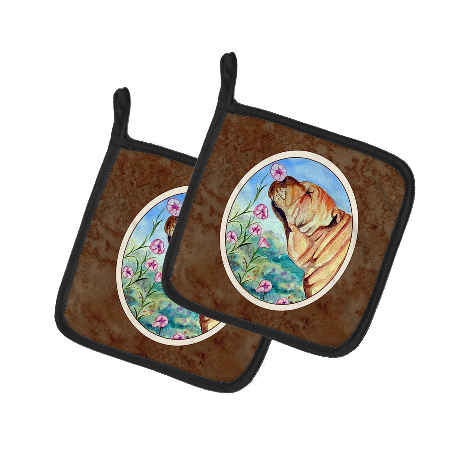 Decorate your space with our Shar Pei artwork on a Pair of Pot Holders. A Pair of Pot Holders to match your kitchen decor. Made in the USA these are thick and functional. Full color artwork decorates the front polyester fabric of the hot pad and accented by a black trim. Use these at as a trivet for your Thanksgiving or Christmas tablescape. Filled with insulated fabric and quilted for durability. These colorful pot holders will make a great gift for your favorite home cook or executive chef. Each pot holder measures approximately 7 1/2 inches by 7 1/2 inches. A hanging tab is included.