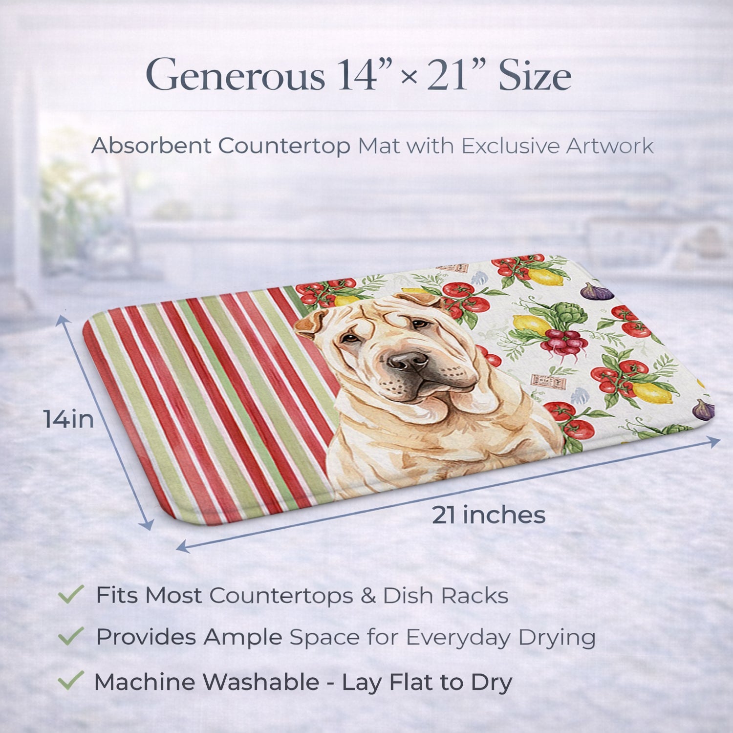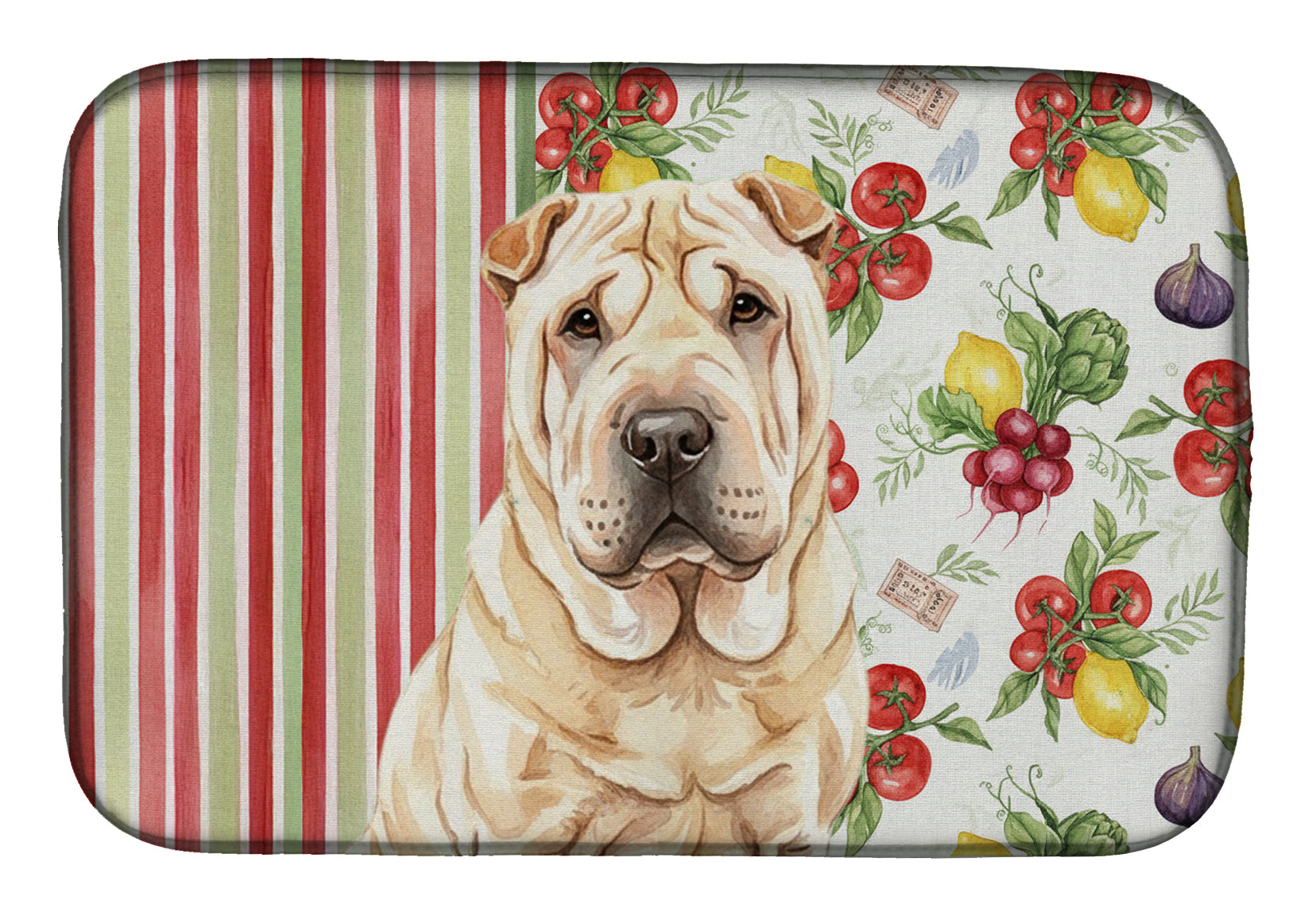 Shown here is the Shar Pei Vegetables Dish Drying Mat from Caroline's Treasures featuring artwork of a Shar Pei in a Everyday design. The detailed illustration and vibrant colors make it a standout accent that celebrates both seasonal style and love for the subject. This image features a vibrant watercolor vegetable pattern with tomatoes, lemons, artichokes, figs, radishes, and leafy greens arranged in a repeating design, paired with classic red and green stripes. The bright, garden-fresh palette creates a cheerful, farmhouse-inspired look that feels lively, welcoming, and perfect for kitchen décor. Everyday décor celebrates personal style and the small moments that make a house feel like home. Thoughtful designs add warmth and personality that can be enjoyed year-round. Say goodbye to messy countertops and soggy dish towels with our innovative dish drying mat. Our high-quality dish drying pad is designed to keep your countertops dry while offering a stylish and efficient solution. Whether you're air drying dishes, glasses, stemware, silverware, pots, pans, bottles, or even fruits and vegetables, our dish mat is the perfect choice. The 14 inches x 21 inches size fits most counters and dish drying racks, and the non-slip design ensures stability. Made with water-absorbent polyester and a polyurethane foam insert, our dish drying mat is not only functional but also durable. It's machine washable and printed in the USA for long-lasting use. The beautiful artwork adds flair to your kitchen decor, making it a perfect housewarming gift or present for any occasion. Upgrade your kitchen experience with our absorbent and versatile dish drying mat. Perfect for: Kitchen counters and sinks, everyday dish drying and countertop protection, Dogs-themed homes, or year-round use for Shar Pei lovers. Shar Peis are distinctive dogs known for their wrinkled skin and reserved temperament. This ancient breed is respected for its loyalty, independence, and calm demeanor. Makes a heartfelt gift for: Shar Pei owners, Dogs lovers, Everyday gifts, pet parents, friends who adore their Shar Pei, or anyone celebrating Dogs.