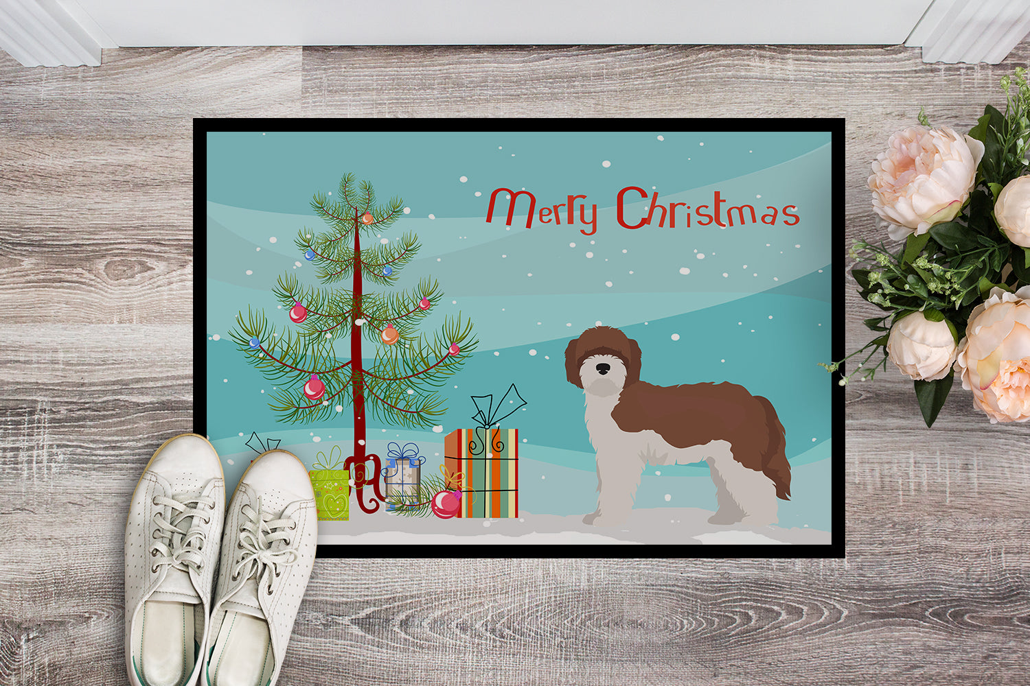 Decorate your space with our Christmas Sheepadoodle artwork on a Doormat. Welcome your guests in style with our Artwork Door Mat, designed to withstand almost any weather condition. This mat, measuring approximately 24 by 36 inches, is held together by durable black binding tape. Its top layer, composed of polyester felt, is dyed with the eye-catching image you see on the mat. A few layers below provide the mat with stability, while its rubber bottom is stamped to help prevent slipping and ensures safety. Our mat works wonderfully as both an indoor or outdoor door mat. For cleaning, simply hose it off with water or use a power washer - no need for any cleaner that produces suds. Avoid scrubbing with a brush, instead, opt for the vacuum on floor setting. Designed manufactured and printed in the USA, this mat is a perfect addition to your porch, outdoor kitchen, entryway, or any indoor space. Its unique design makes it a charming decorative rug that greets your guests and adds a stylish touch to your home decor.