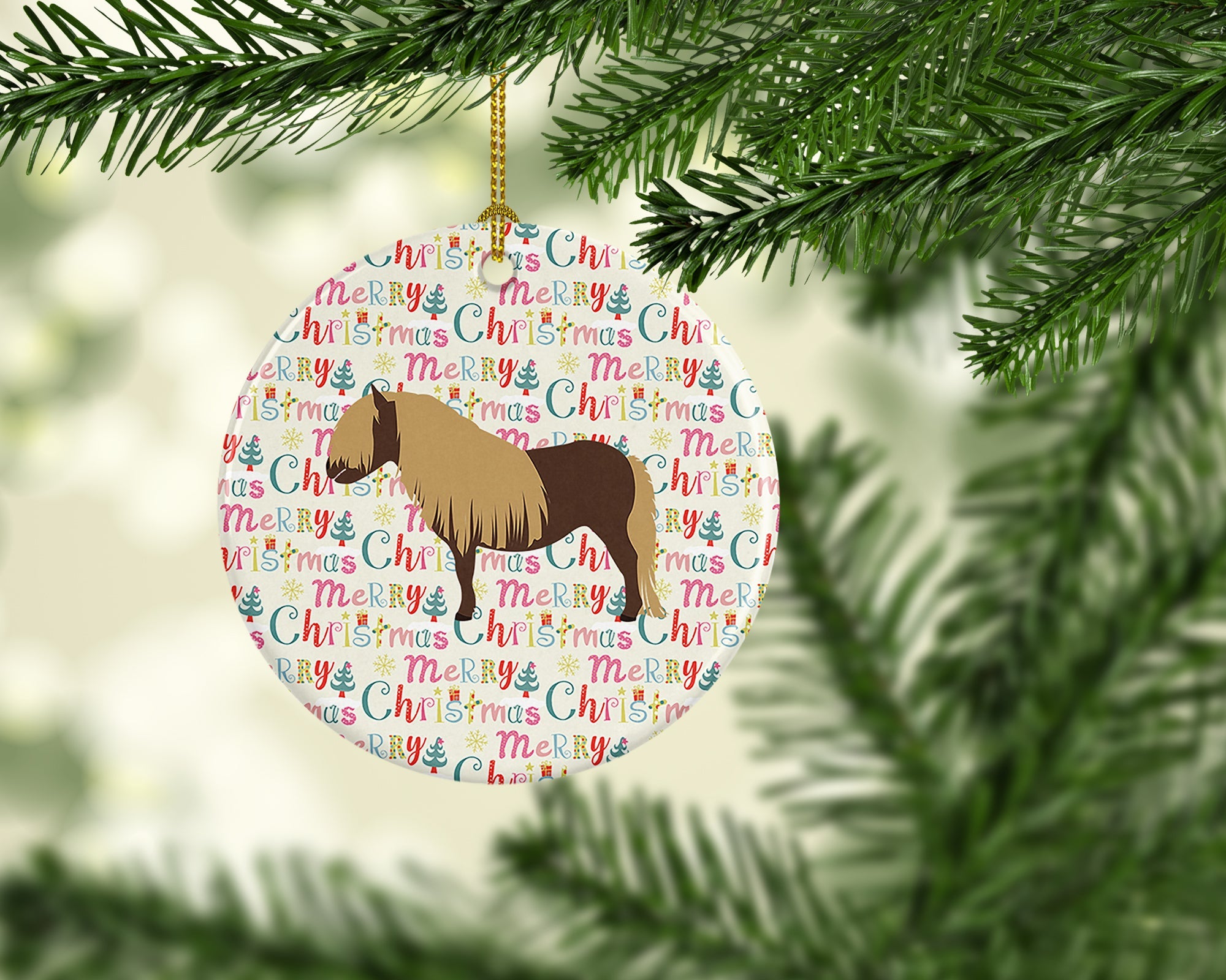 Decorate your space with our Christmas Shetland Pony Horse artwork on a Ornament. Add a touch of personalized charm to your Christmas tree this holiday season with our Ceramic Ornament. Measuring 2.8125 inches in diameter, this round porcelain ornament beautifully reflects your festive lights, enhancing your holiday decor. The gloss surface sets off the vibrant, full-color artwork contributed by one of our talented artists, bringing a pop of color and joy to your tree. This Ceramic Ornament doesn't stop at being merely decorative. The white back is designed for personalization. Write a heartfelt message, mark a special year, or inscribe a date with a paint pen or a permanent marker to create a treasured memento. Please ensure you allow any personalization to dry thoroughly before handling to maintain the pristine finish. Included with the ornament is a delicate gold cord for easy hanging. Made in the USA, this Ceramic Ornament makes an exceptional gift for a pet sitter, teacher, family member, or anyone you wish to share a little Christmas magic with. With its blend of style, charm, and personal touch, it's a meaningful addition to any Christmas tree.