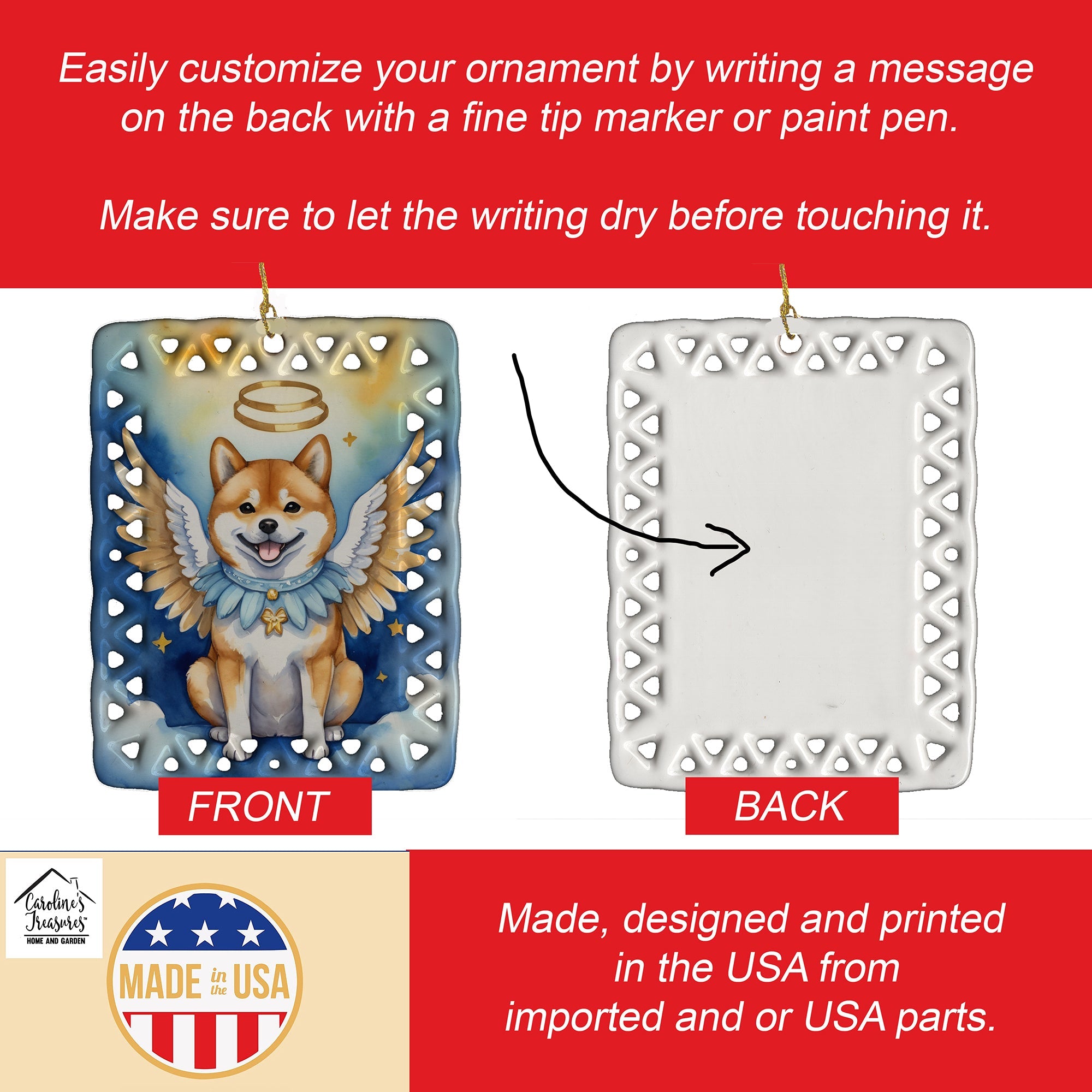 Porcelain Ornament featuring breed specific Shiba Inu artwork. Celebrate Christmas with this Christmas Ornament. Add a unique, personal touch to your holiday decor with our Rectangular Lattice Porcelain Ornament. Perfect for creating cherished memories, this high-quality ornament shines under festive lights, reflecting warmth and joy throughout your Christmas tree. Crafted with a glossy finish, it showcases vibrant, full-color artwork contributed by our talented artists, ensuring your tree is adorned with a burst of color and holiday spirit. What sets this Porcelain Ornament apart is its customizable white back. Use a paint pen or permanent marker to write a heartfelt message, commemorate a special year, or mark an unforgettable date, turning this ornament into a keepsake that will be treasured for years to come. For best results, allow any personalization to dry thoroughly before handling. Each ornament comes complete with a delicate gold cord, making it easy to hang and display. Proudly made in the USA, this ornament measures 3.375 x 2.625 inches and is a thoughtful gift for pet sitters, teachers, family members, or anyone who would appreciate a little extra holiday magic. Bring style, charm, and a touch of personal meaning to your Christmas tree with this beautifully designed ornament..