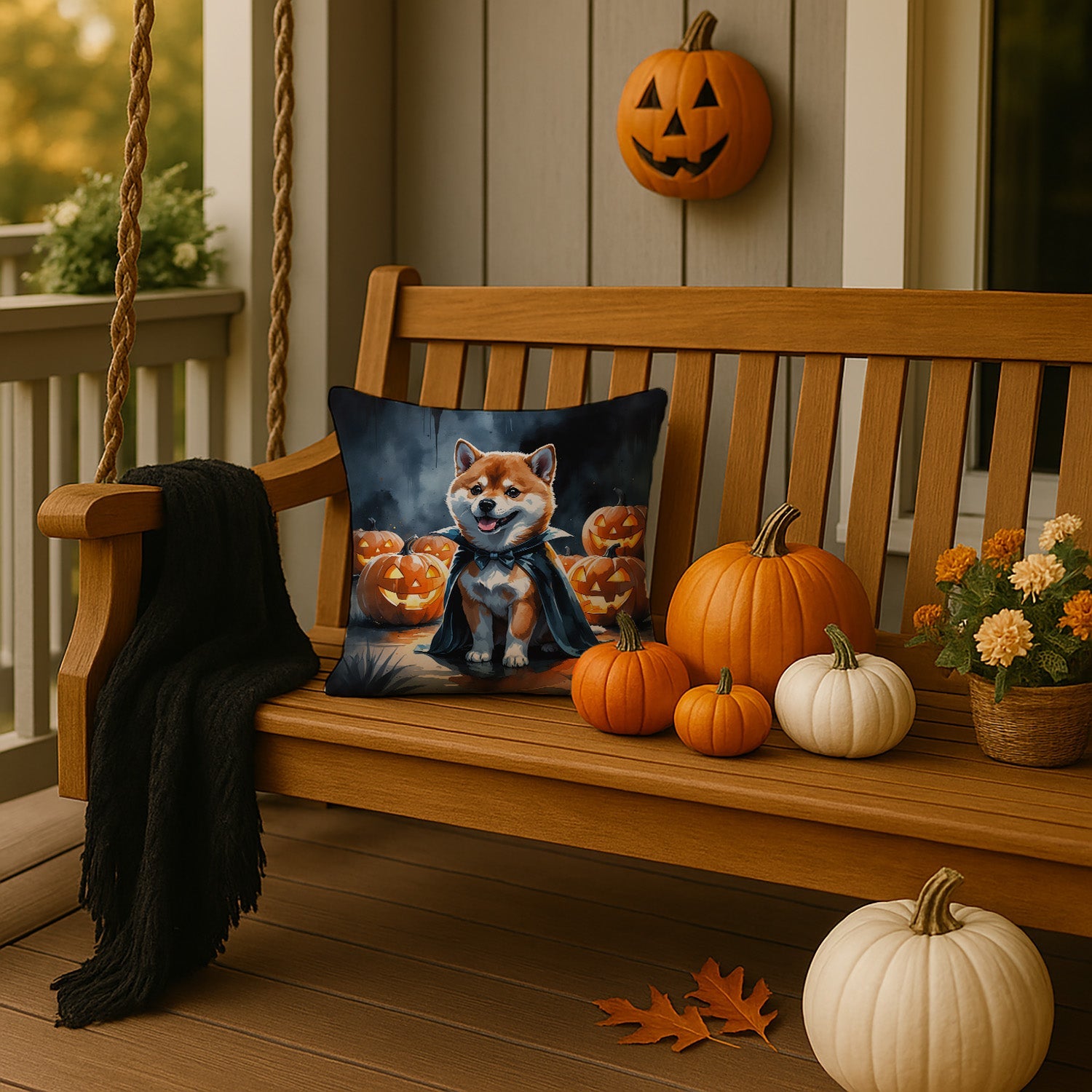 Throw Pillow featuring breed specific Shiba Inu artwork. Celebrate Halloween with this Halloween Pillow. Add a touch of vibrancy and comfort to your outdoor seating with Caroline's Treasures Fabric Decorative Pillow. Measuring approximately 14 inches by 14 inches, this outdoor pillow is crafted to elevate the appeal of your patio furniture, infusing it with vivid color and artistic flair. The pillow includes a 100% Polyester Fabric sham filled with a quality pillow form to provide superior comfort. Innovatively made from our brand new material, specifically woven for its water resistance, this pillow is designed for durability. The soft canvas fabric offers versatility in use, fit for your indoor couch or your outdoor patio, porch, or veranda. The fabric is dyed with colorfast dyes built for resilience against weather conditions, ensuring the pillow retains its beauty over time. Constructed by sewing three fabric pieces to create a sham, the polyester insert is then nestled inside to form the pillow, resulting in an overstuffed pillow that maintains its shape. Both the sham and the pillow insert are proudly made in the United States. As the pillows are handcrafted, there may be minor variations in size, further enhancing their unique charm. Experience comfort in style with Caroline's Treasures Fabric Decorative Pillow.